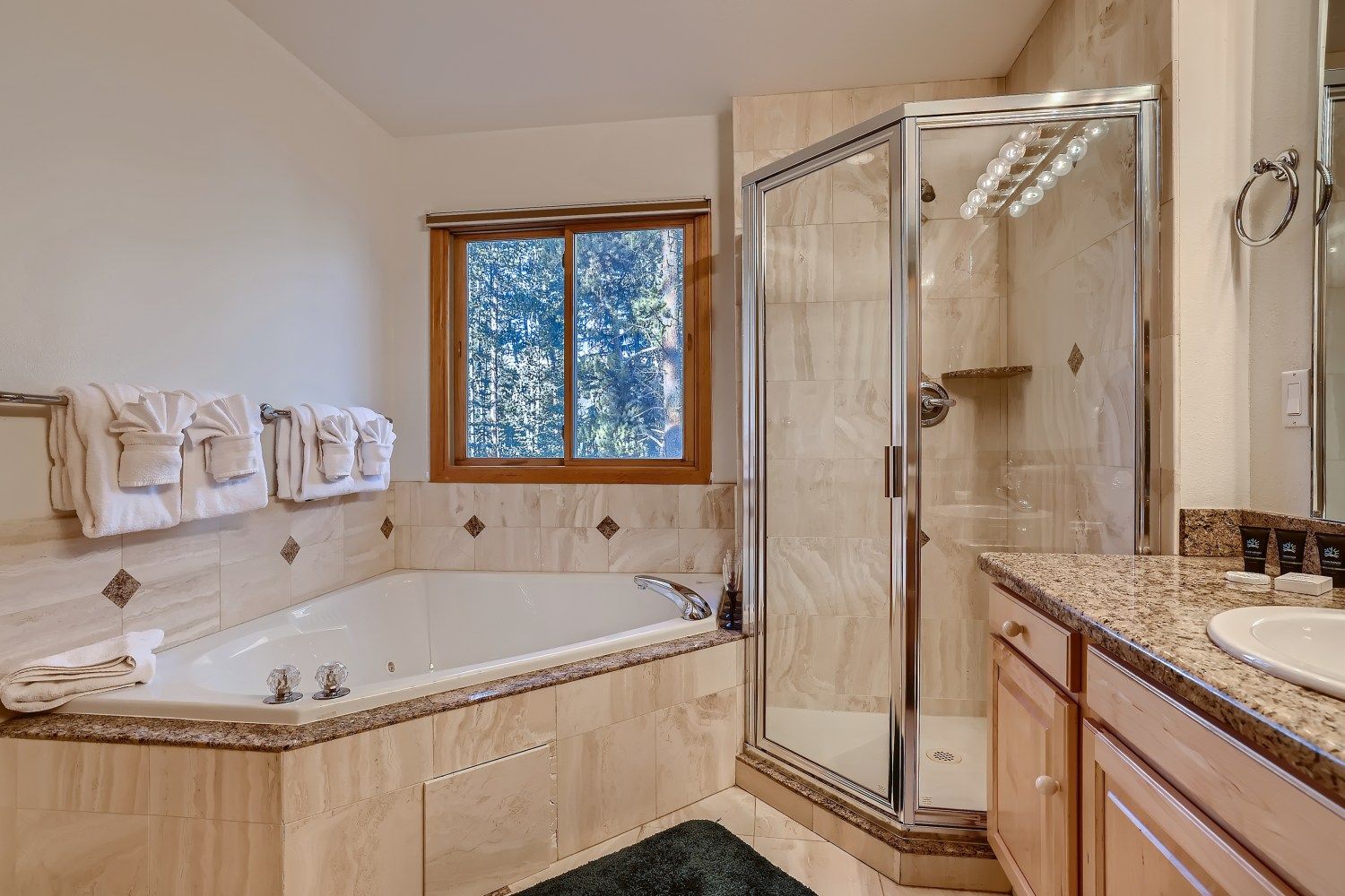 - Master suite: king bed, private attached bathroom with a jetted soaking tub, walk-in tile shower and 2 sinks, flat-screen TV. (sleeps 2)