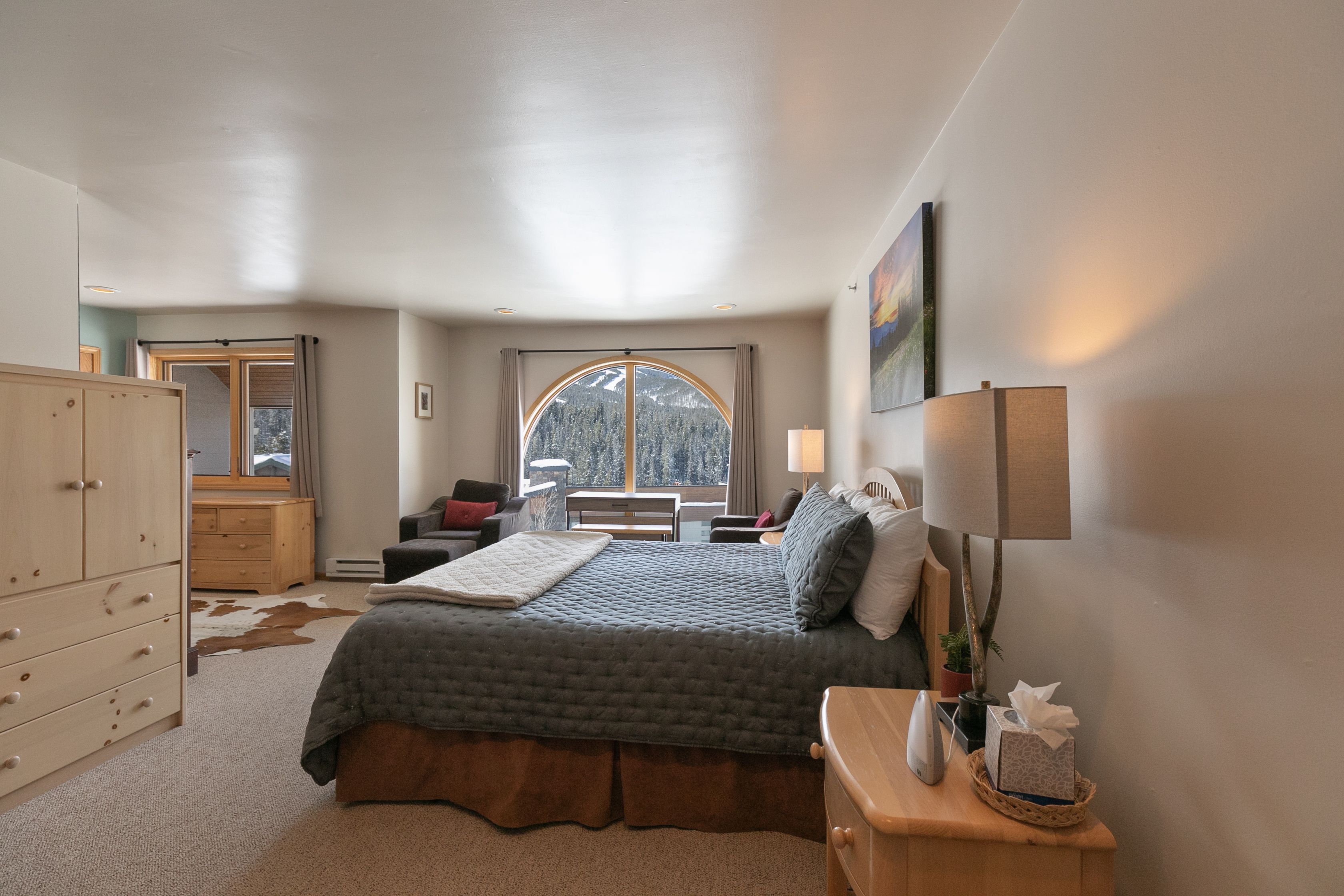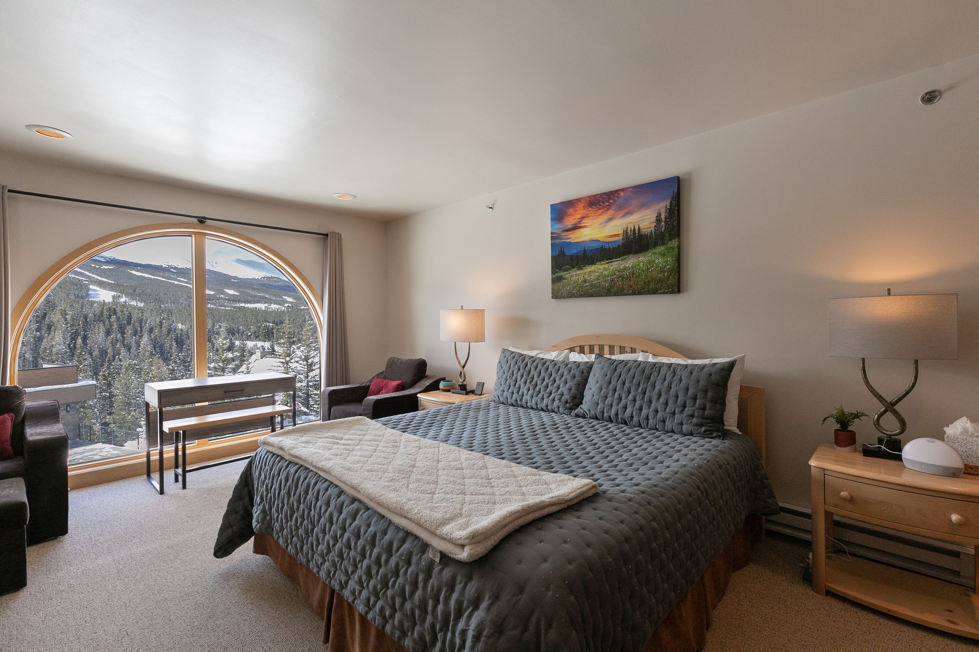 • King master suite: king bed, private bathroom with walk-in tile shower, flat-screen TV, chairs/reading area, desk/work area, slope views. (sleeps 2)