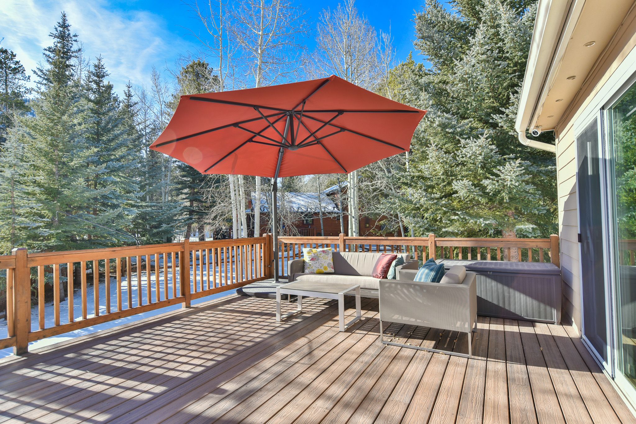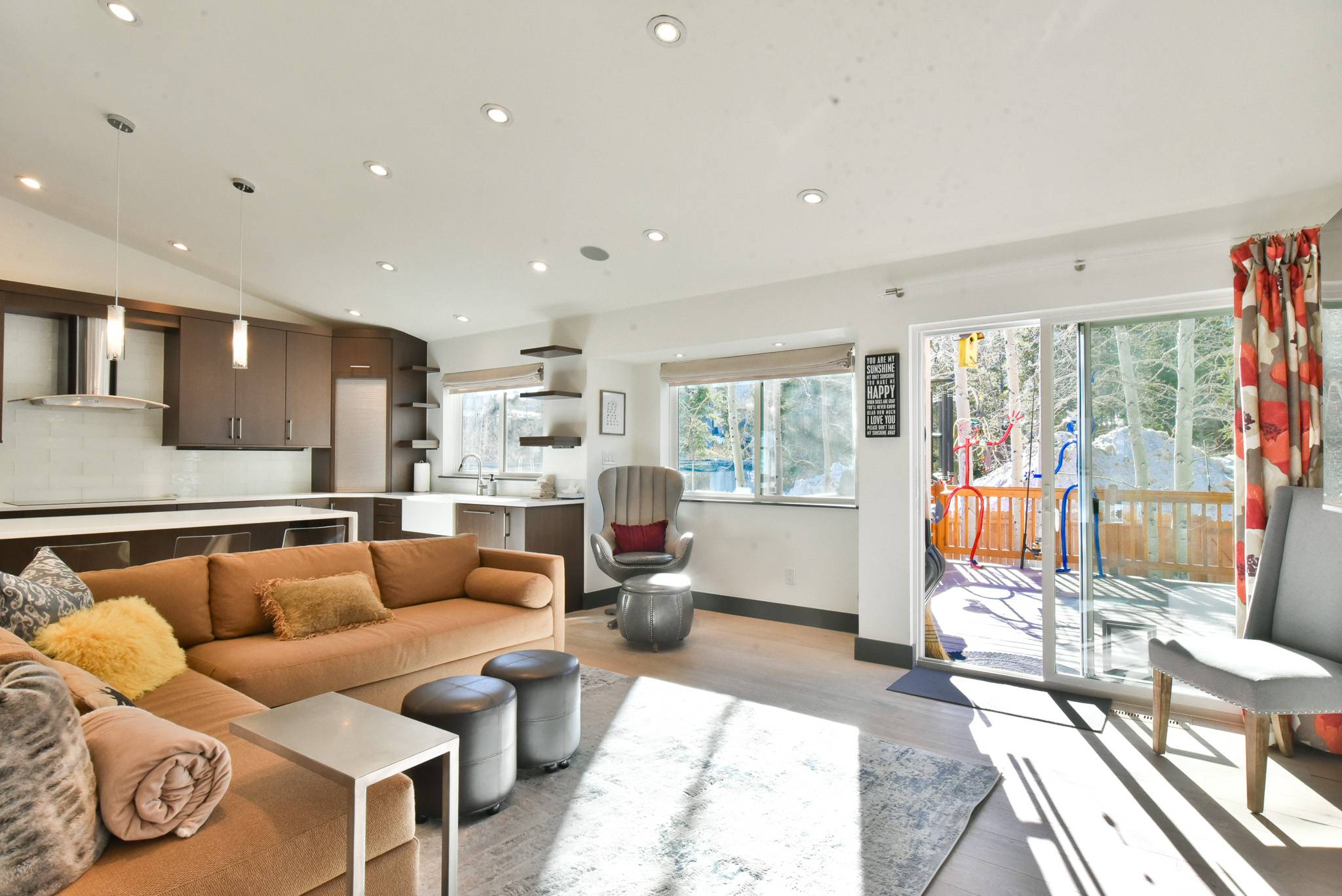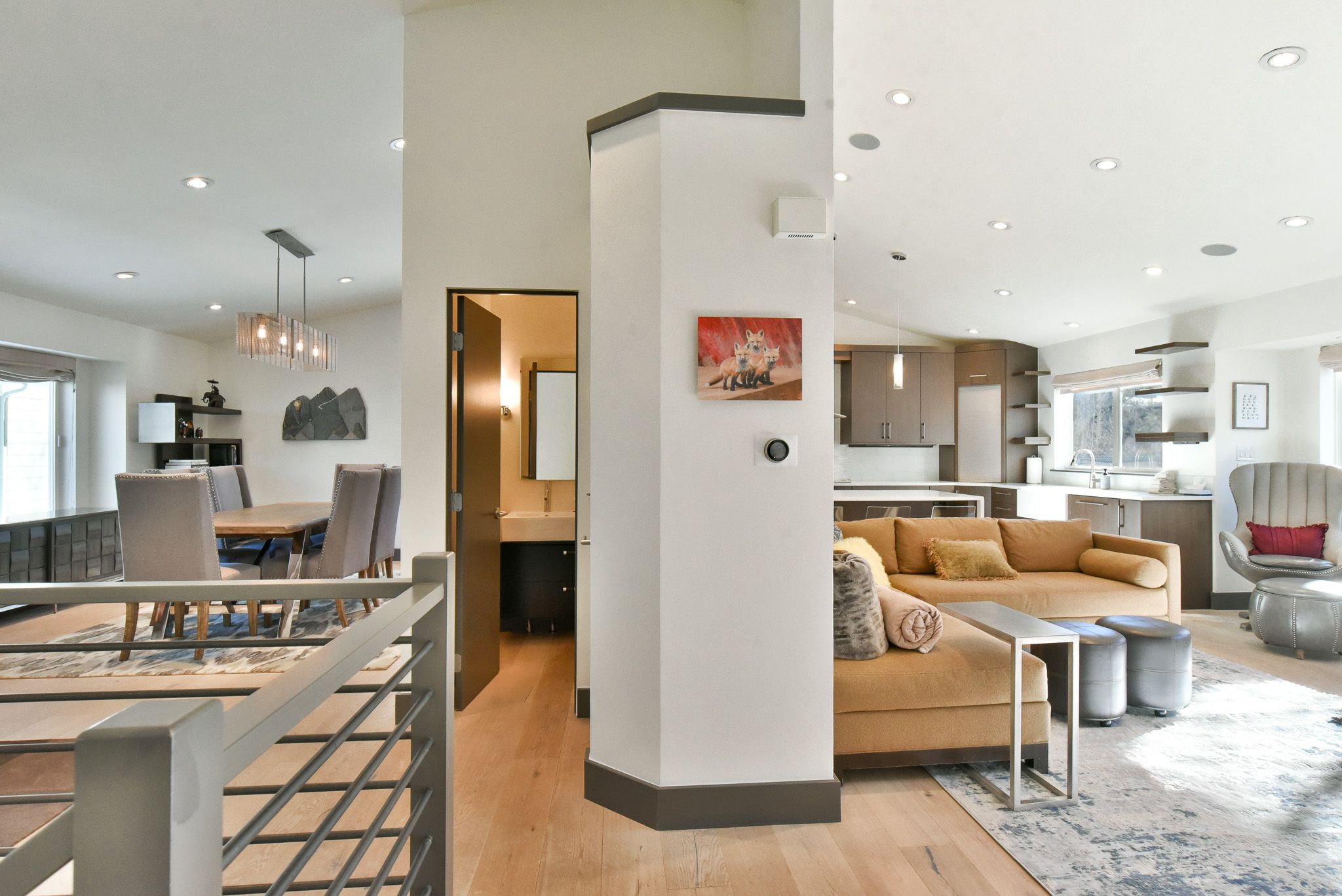 Inside, the home is filled with natural light and thoughtful updates throughout. The west-facing orientation brings in warm afternoon sun and beautiful views of Mt. Royal, especially from the living space and patio. Hardwood floors span the main level, vaulted ceilings add volume and openness, and the recently updated kitchen features stainless steel Thermador appliances, an induction cooktop, generous countertops, and a breakfast bar. A dedicated dining area with a large table makes it easy for everyone to gather for meals, games, or planning the next adventure.