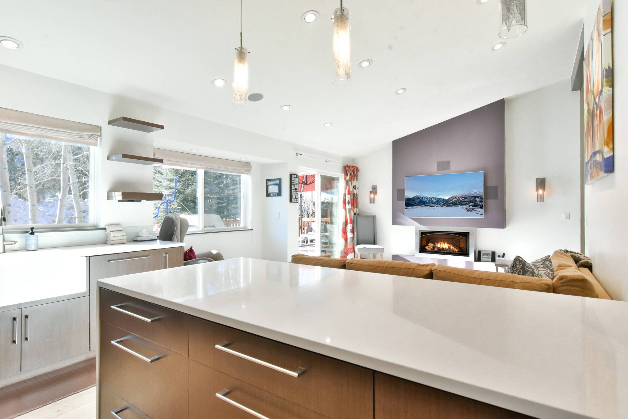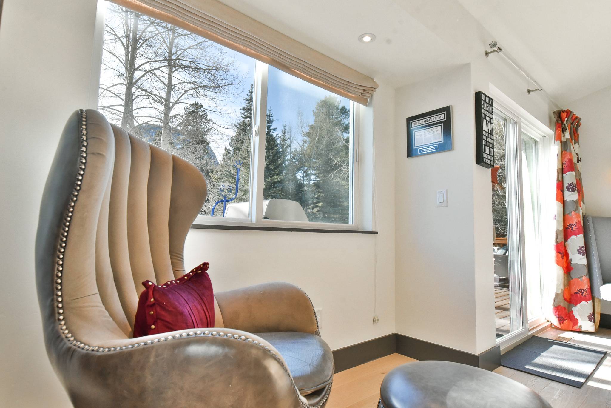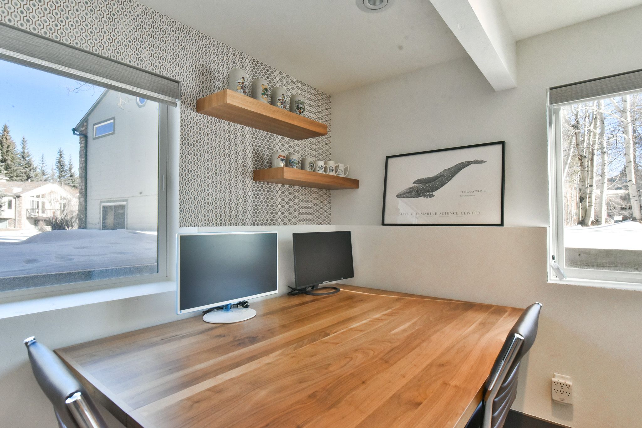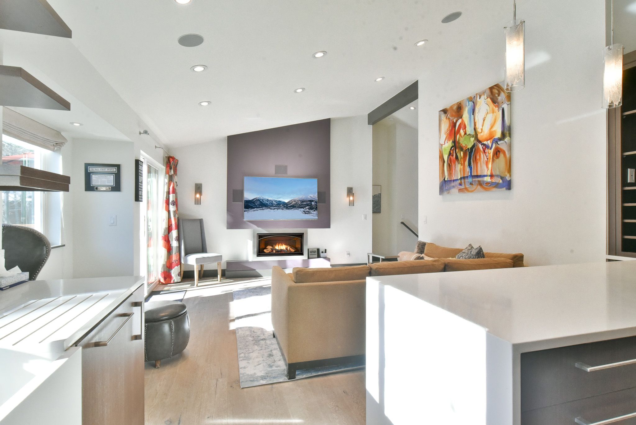 Inside, the home is filled with natural light and thoughtful updates throughout. The west-facing orientation brings in warm afternoon sun and beautiful views of Mt. Royal, especially from the living space and patio. Hardwood floors span the main level, vaulted ceilings add volume and openness, and the recently updated kitchen features stainless steel Thermador appliances, an induction cooktop, generous countertops, and a breakfast bar. A dedicated dining area with a large table makes it easy for everyone to gather for meals, games, or planning the next adventure.