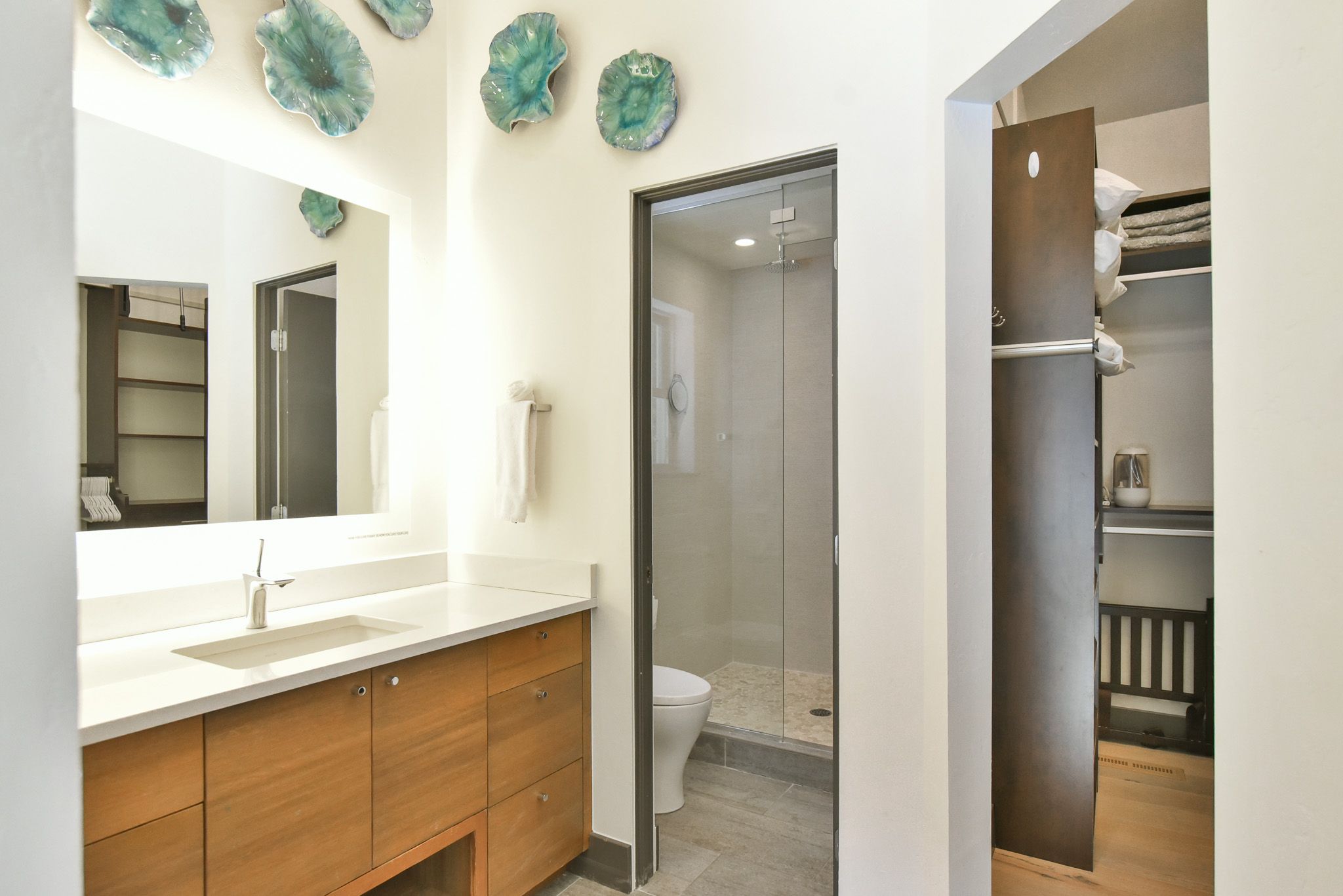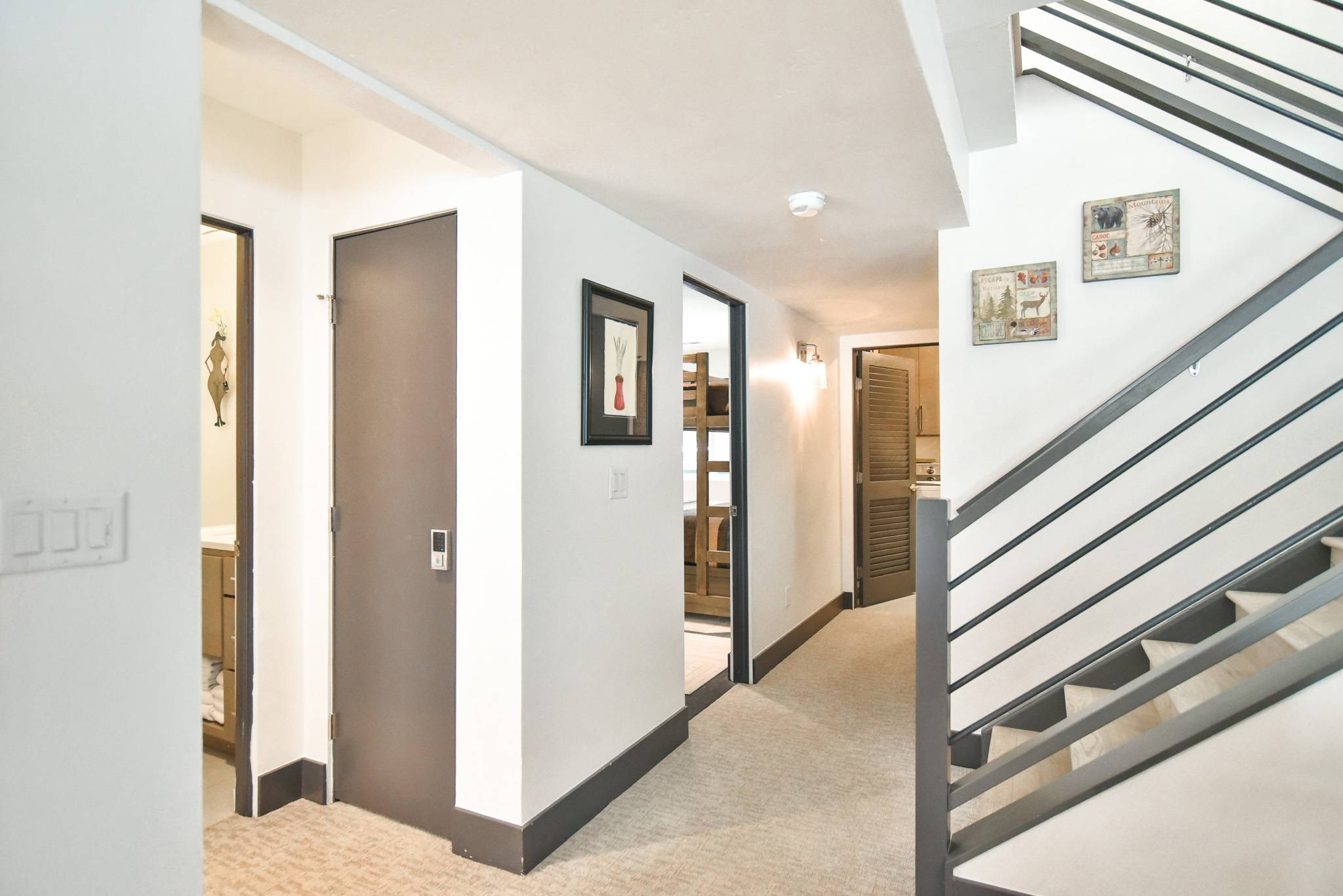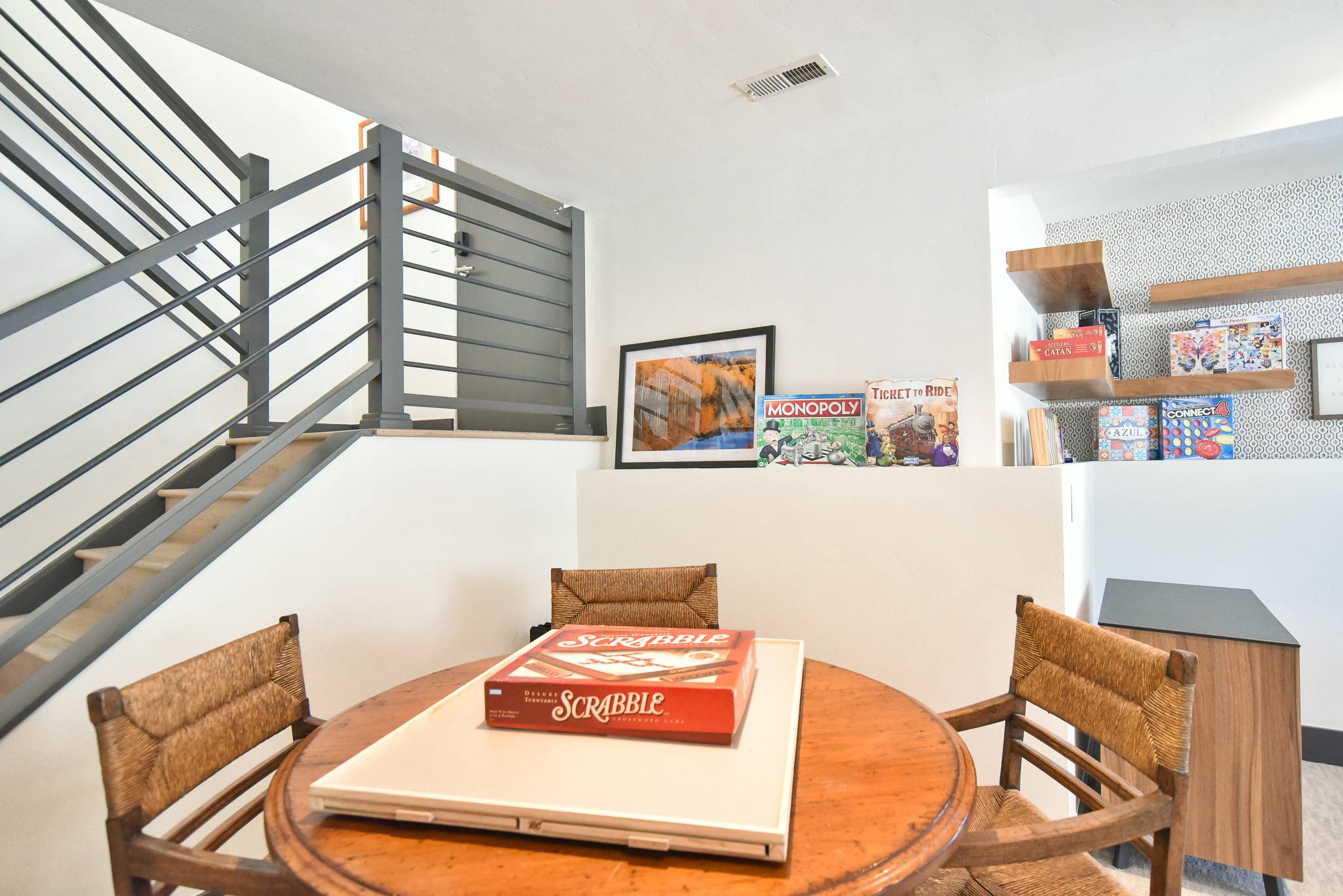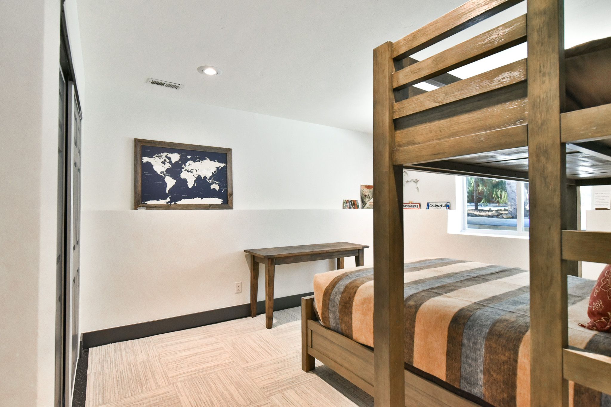 The layout offers space and flexibility for groups to spread out comfortably. Upstairs, the primary king suite features vaulted ceilings, abundant natural light, direct patio access, and an ensuite bathroom with dual vanities, a large walk-in tile shower, and a spacious closet. Downstairs, a second living area includes a dedicated workstation, making it easy for remote work or quiet time. You will also find a king bedroom, a twin-over-queen bunk bedroom, and a shared full bathroom with a shower and tub combination. A full laundry room, one-car garage, and additional outdoor parking round out the home’s conveniences.