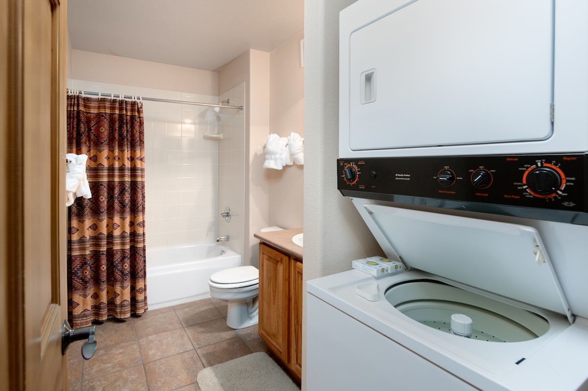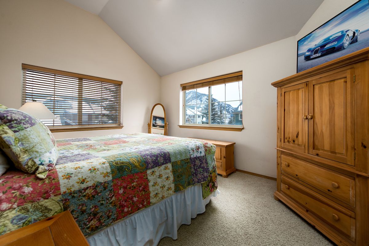 This 1-bedroom, three-bathroom condo sleeps up to six, so it’s ideal for a mid-sized family or a guys’ or girls’ getaway. The living area has comfortable furniture, a gas fireplace, and a flat-screen TV, as well as killer mountain views. The full kitchen has everything you need to keep the gang fed and happy; the dining table seats six, and there’s room for three at the counter as well.