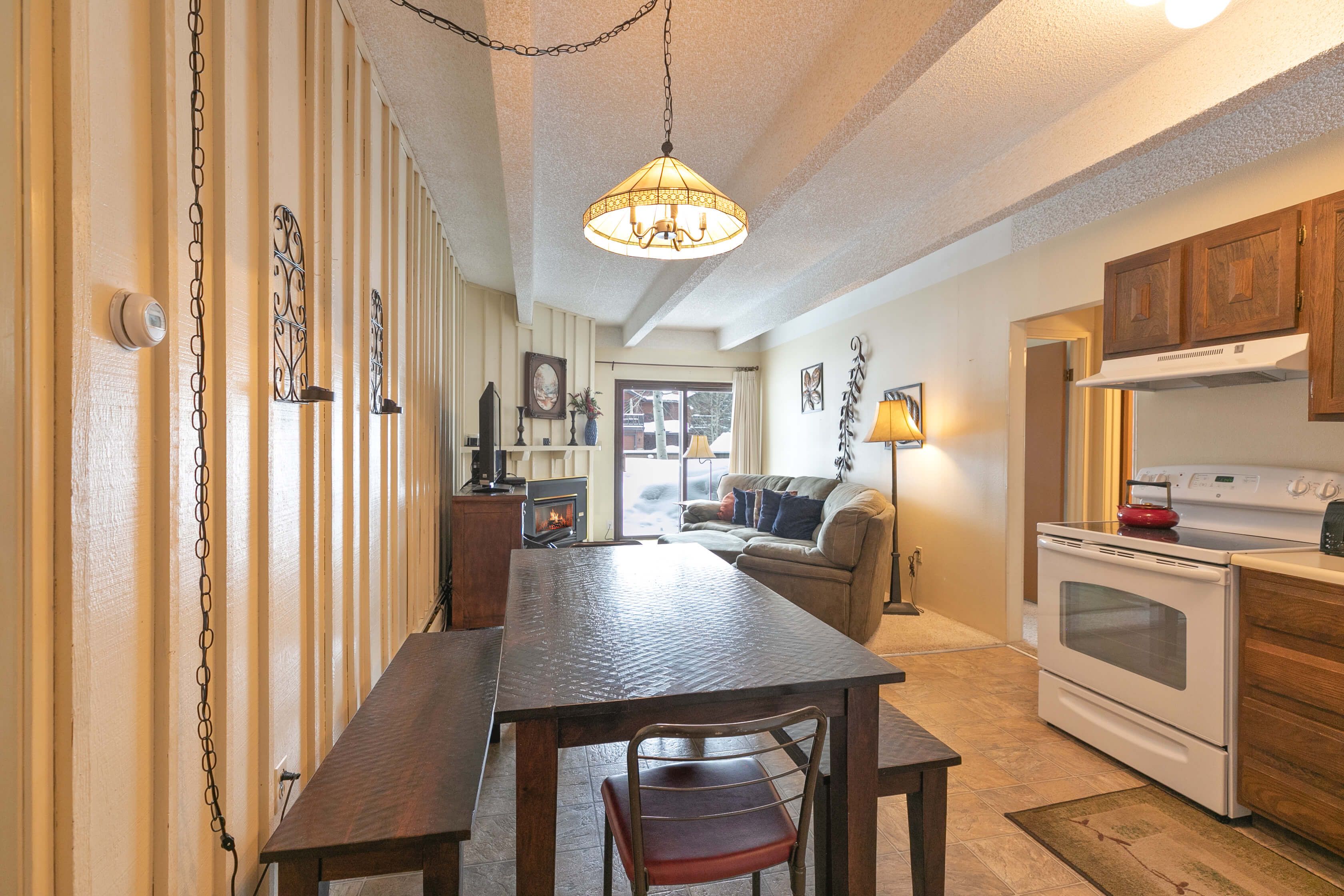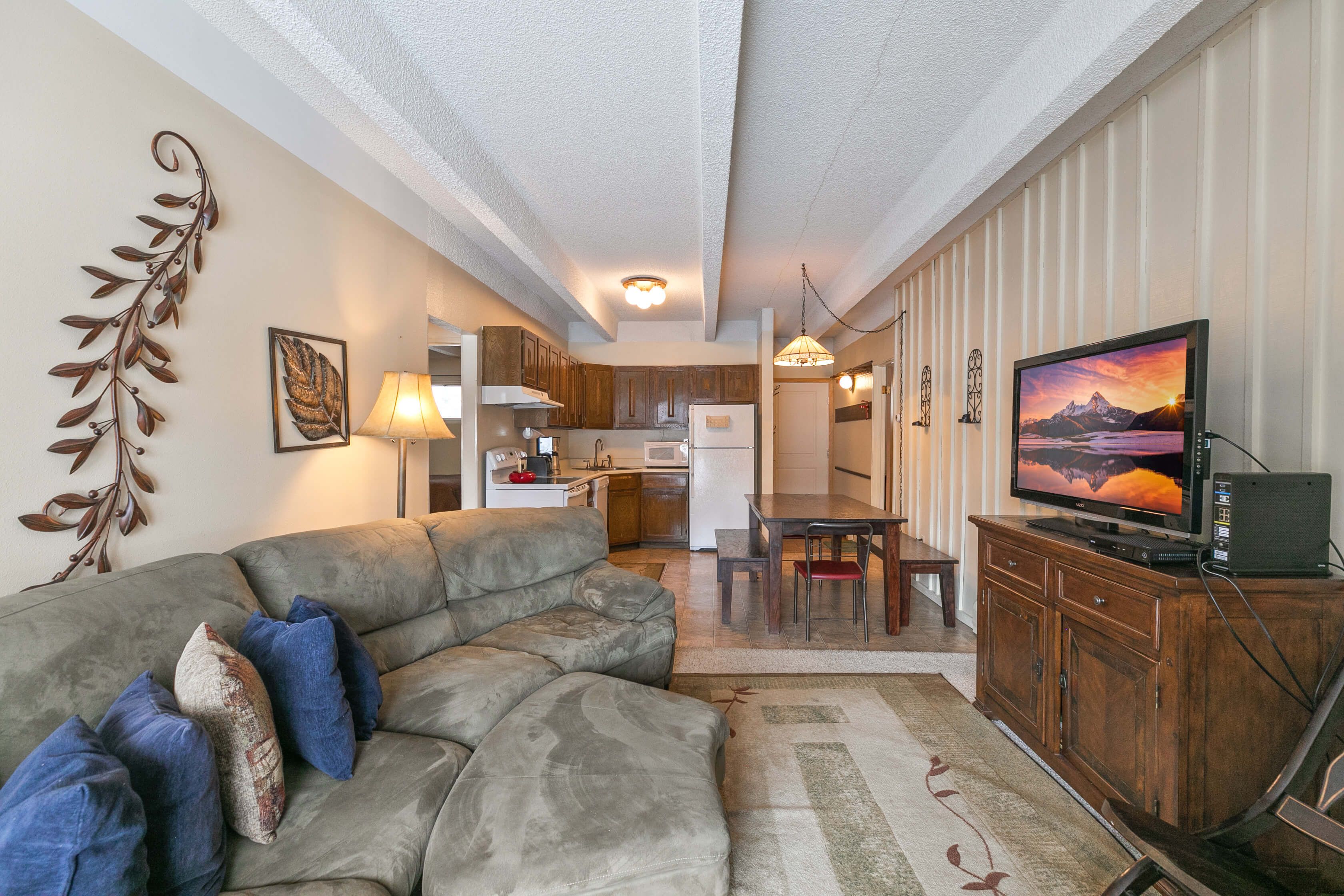 Ten Mile Creek 112 is a 2-bedroom, 2-bathroom condo that’s perfect for families or groups of up to four people. The living area welcomes you with a gas fireplace and a huge, cozy couch — it’s perfect for relaxing after a day on the slopes or catching a movie (or the morning snow report) on the large flat-screen TV. Just outside, there’s a large patio area and table for hanging out as well. There’s a fully equipped kitchen with everything you’ll need to keep the troops fed from breakfast through dinner, and a dining table that seats six.