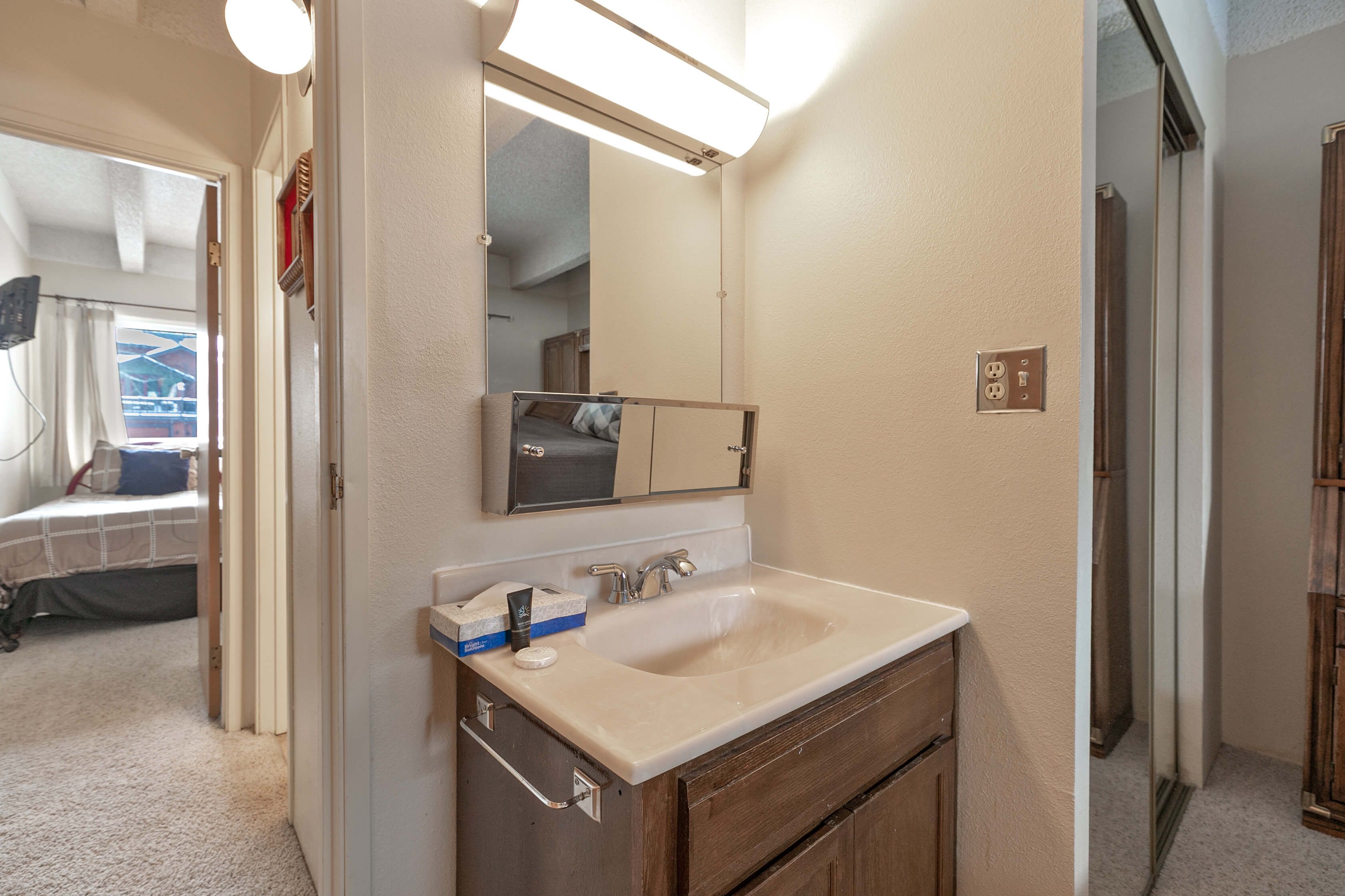 - Bedroom 2: queen bed, sink/mirror. (sleeps 2)