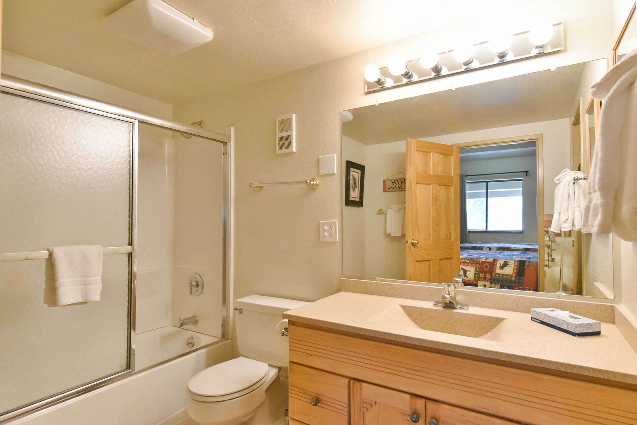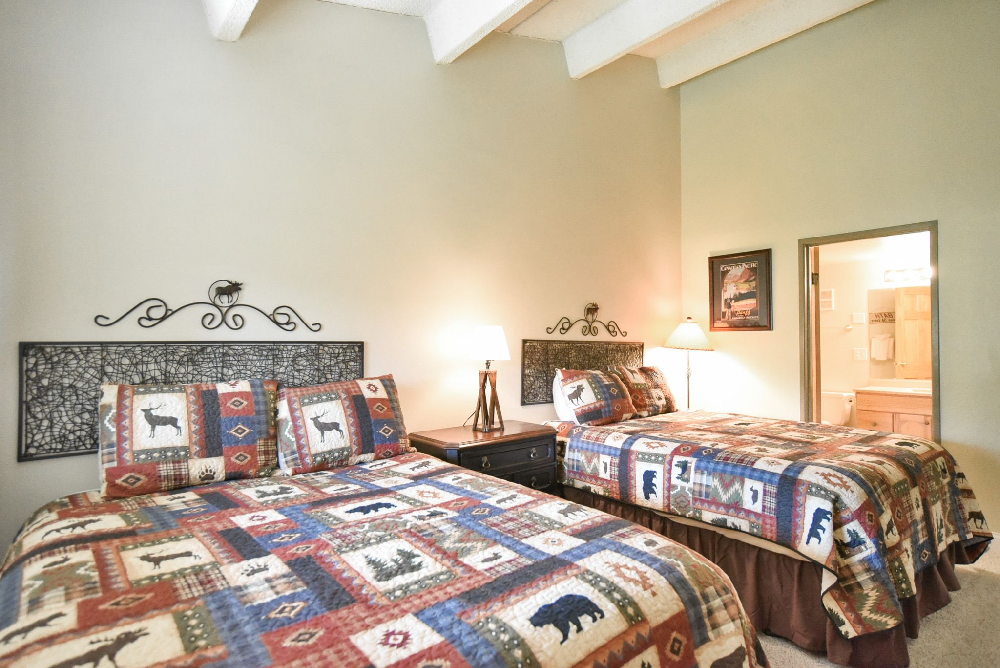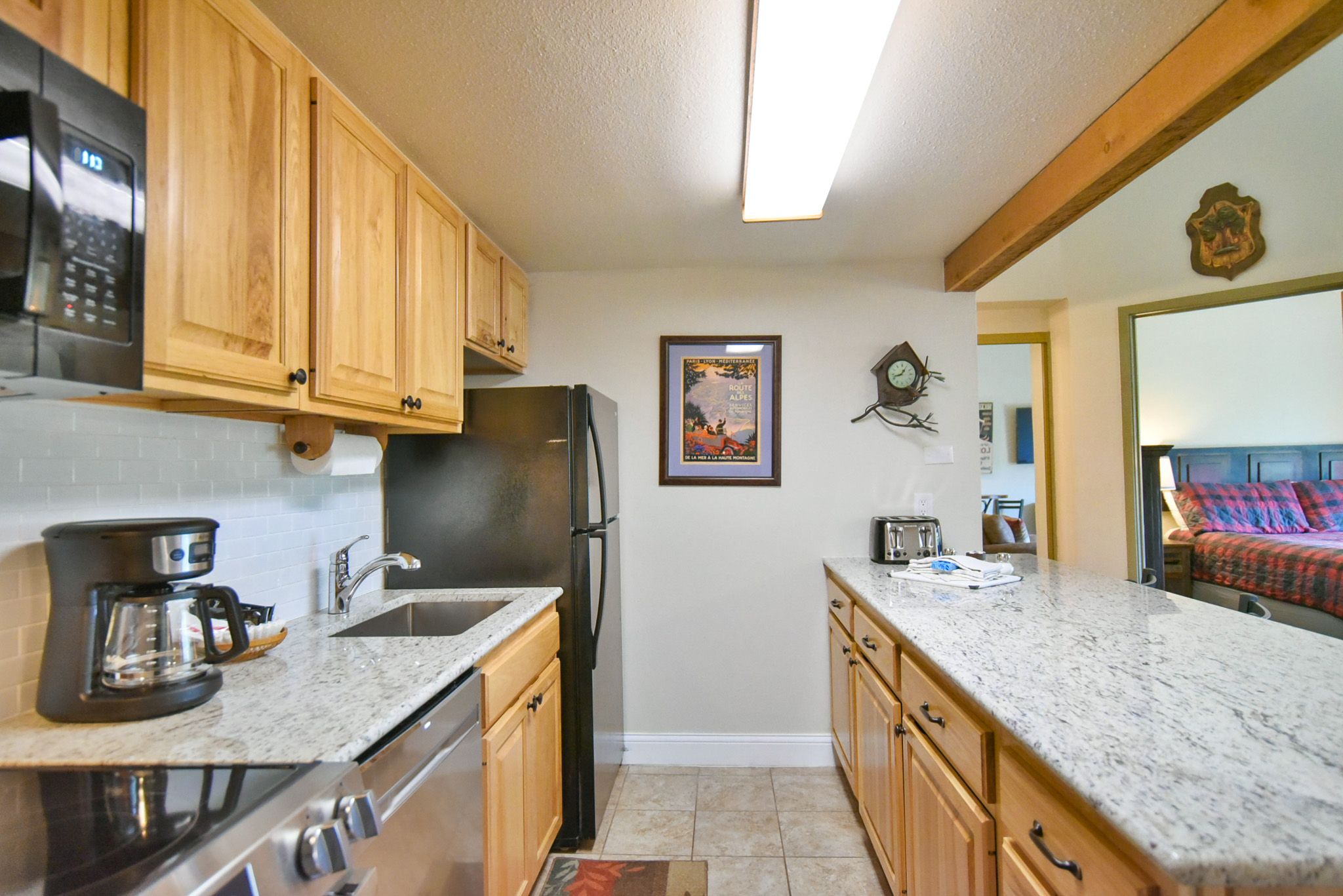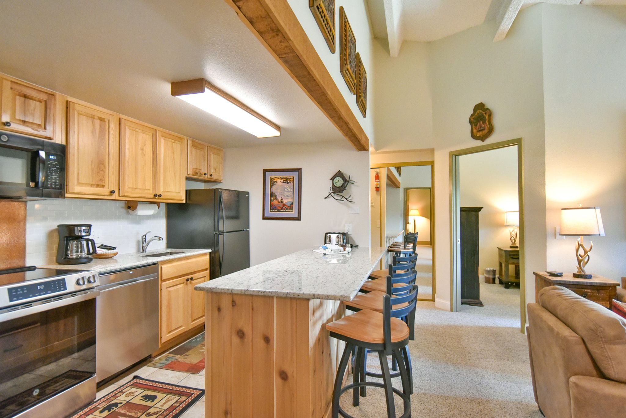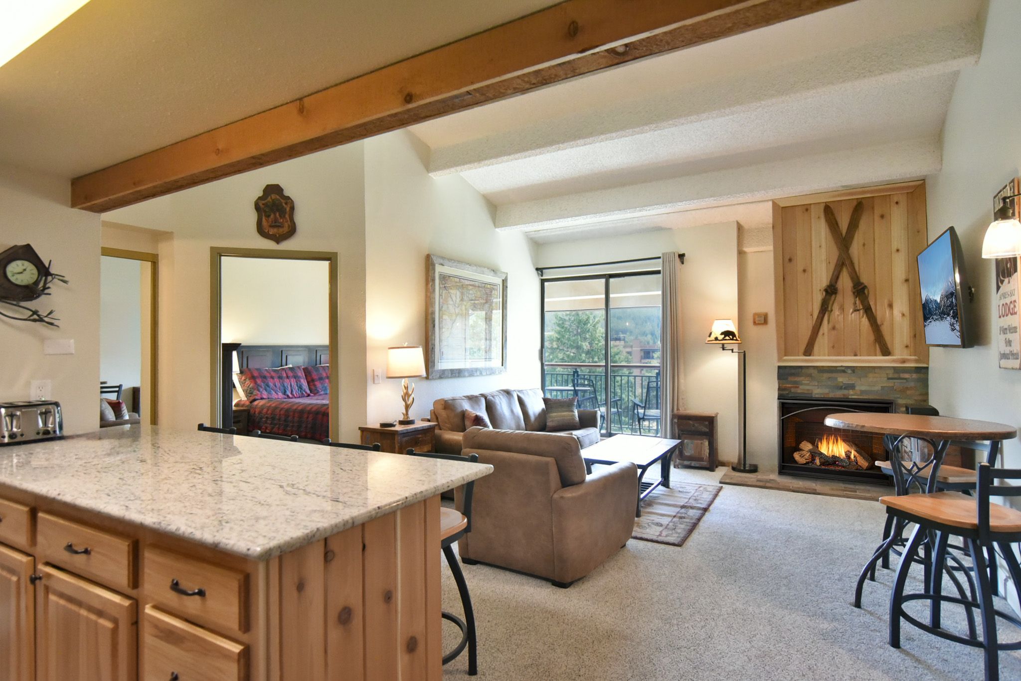 Inside, the condo sleeps up to eight guests and features a bright, open-concept living area with a gas fireplace, sleeper sofa, and private patio that overlooks the ski runs. The full kitchen includes a breakfast bar and small dining nook—ideal for fueling up before a day of mountain adventure. Building amenities include a ski locker, indoor and outdoor hot tubs, and access to the nearby Upper Village Pool, open seasonally with its outdoor heated pool and additional hot tubs. A paid laundry facility is located on-site, and parking is available for one vehicle.