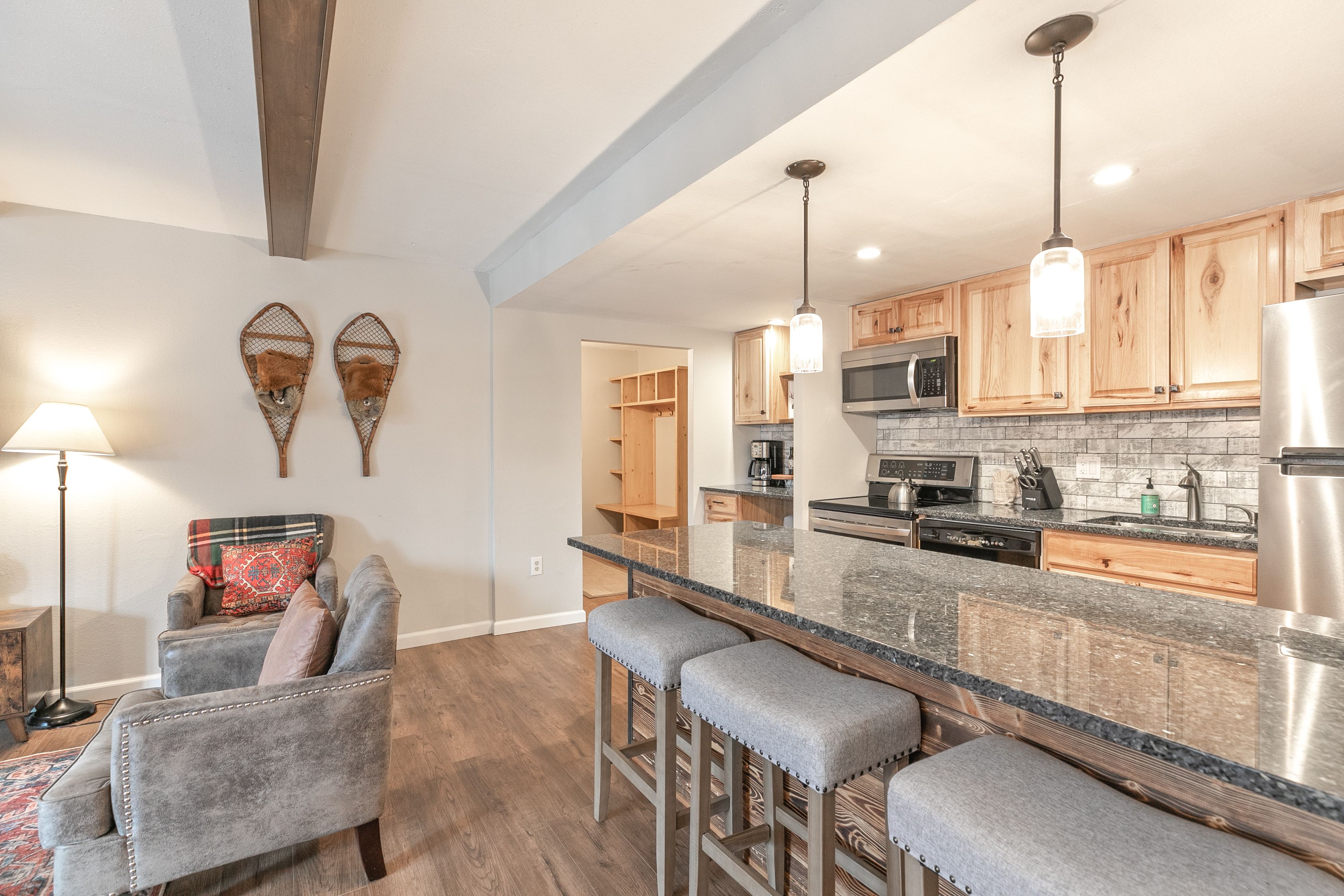 Trails End Cozy Condo is a 1-bedroom, 1-bathroom deluxe condo that’s perfect for groups of up to four. In the living area, there’s comfy seating, a gas fireplace and a large flat-screen TV; it’s the perfect place to relax and share stories about the day’s Rocky Mountain adventures. The kitchen feature granite counters, stainless-steel appliances, and all the gear you’ll need to whip up everything from snacks to holiday meals. The kitchen counter comfortably seats 4 people.