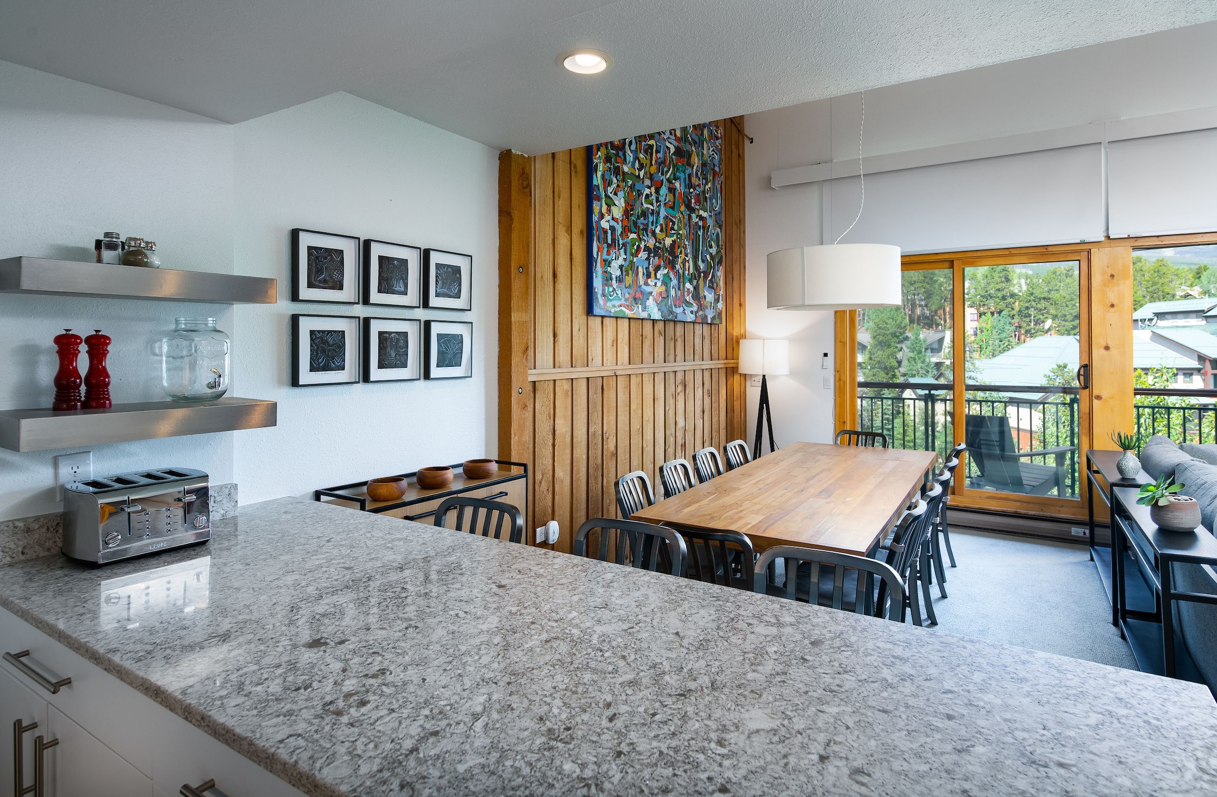 Trails End Mountainview Penthouse is a 4-bedroom, 4-bathroom penthouse condo that’s perfect for groups of up to eight. In the living area and a large flat-screen TV; the views of the mountains and Breck’s ski slopes are fantastic, too. Please note, the fireplace in the living room is not functional. There’s also a private patio to take in the views and crisp mountain air. The kitchen feature granite counters and all the gear you’ll need to keep the troops happy and fed when you’re not exploring Breck’s great dining options. There’s room for 10 at the dining table plus four more at the counter.Â