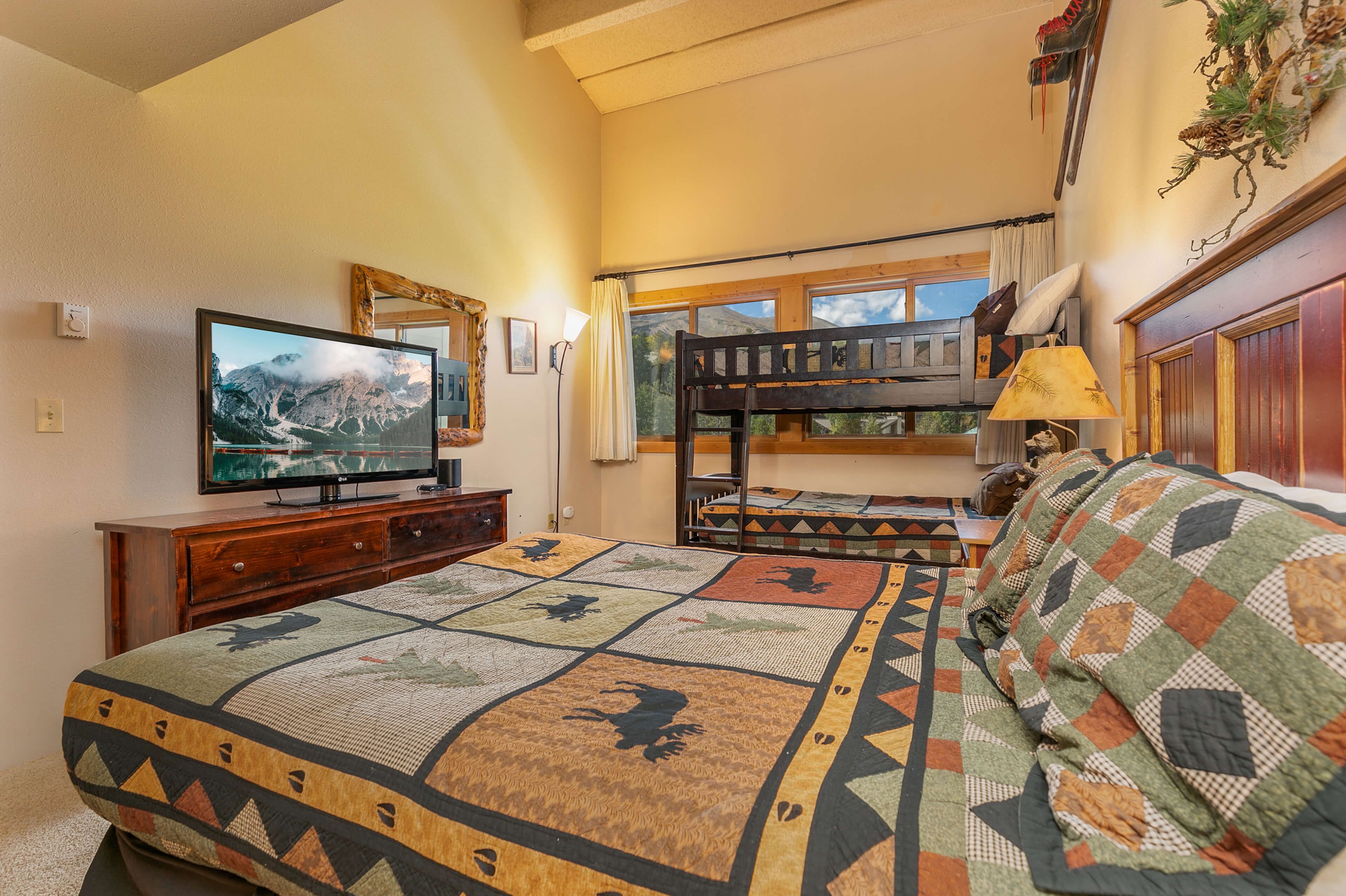- Master suite: queen bed, twin bunk bed, private bathroom with tub/shower, flat-screen TV, mountain views.