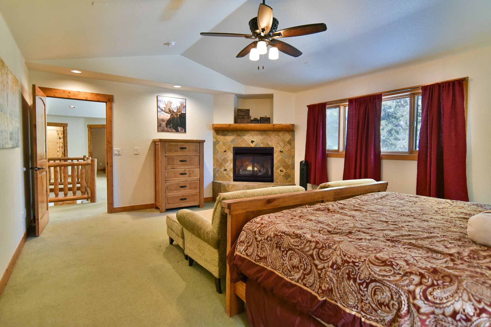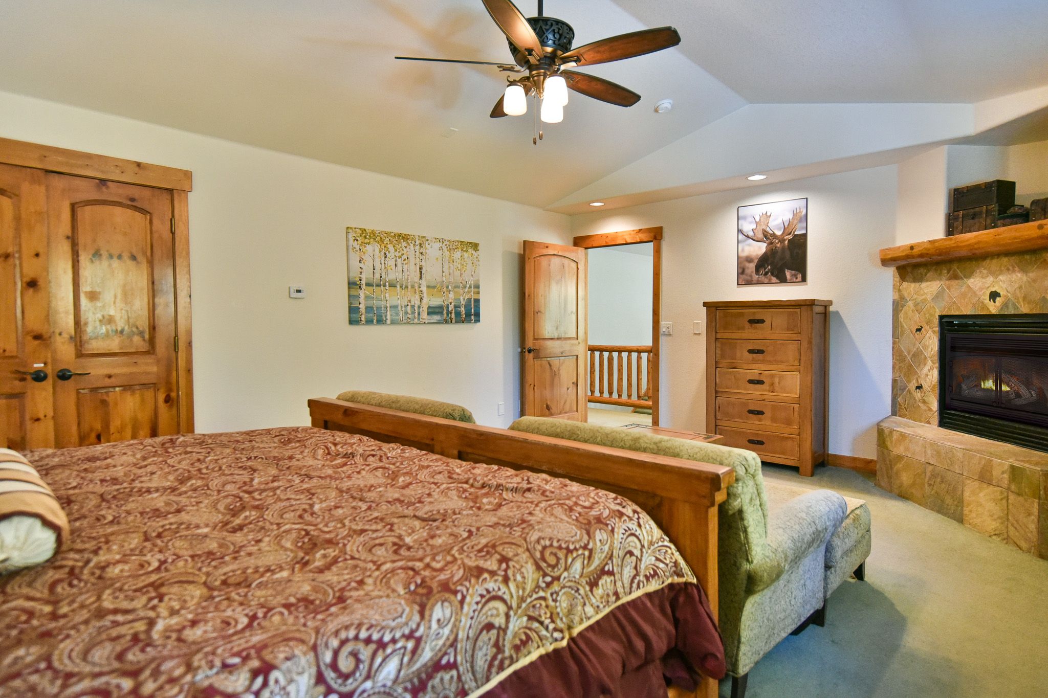 - King master suite: king bed, gas fireplace, private bathroom with tub/shower. (sleeps 2)