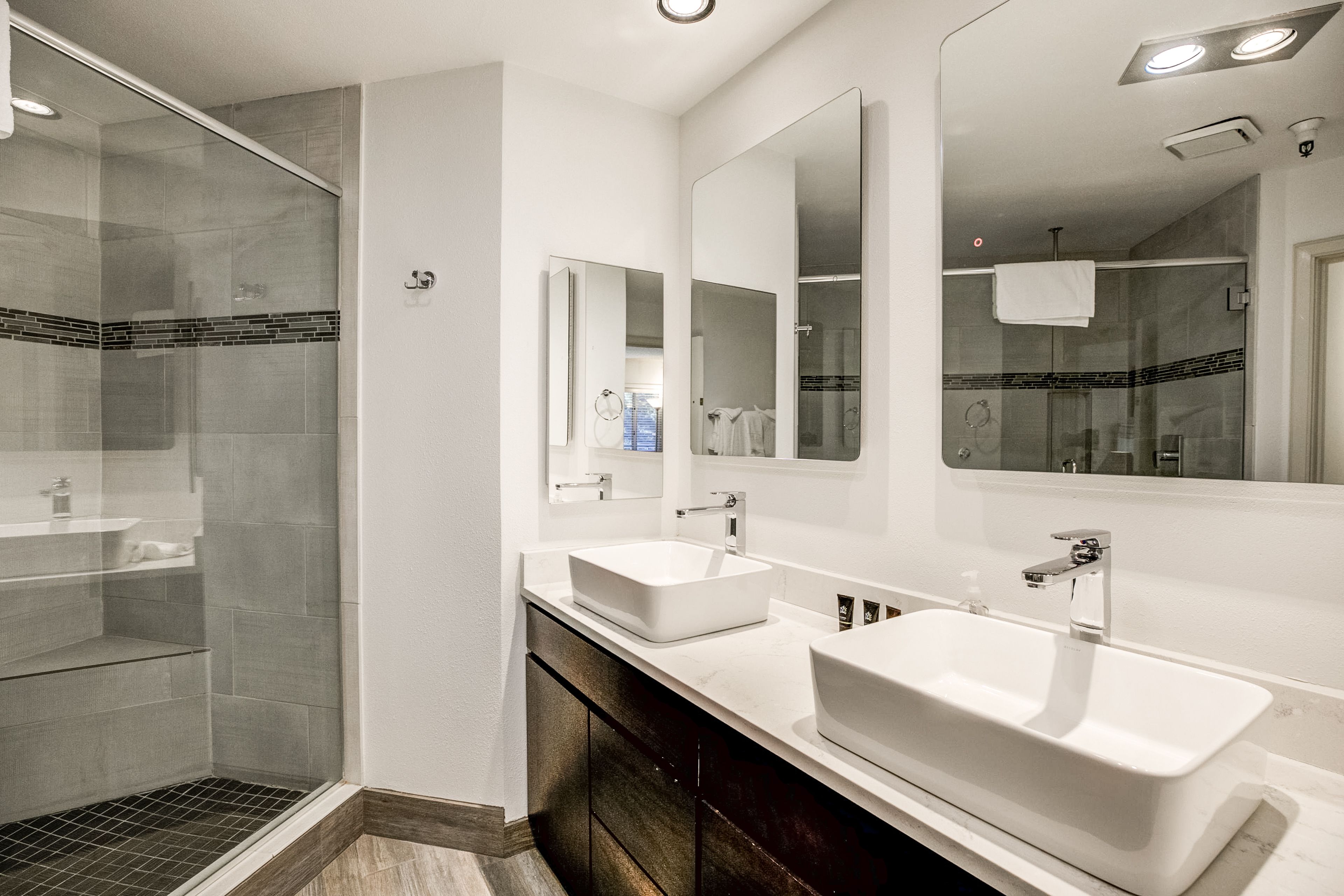 - Master suite: King bed, private bathroom with walk-in tile shower and 2 sinks, flat-screen TV. (sleeps 2)