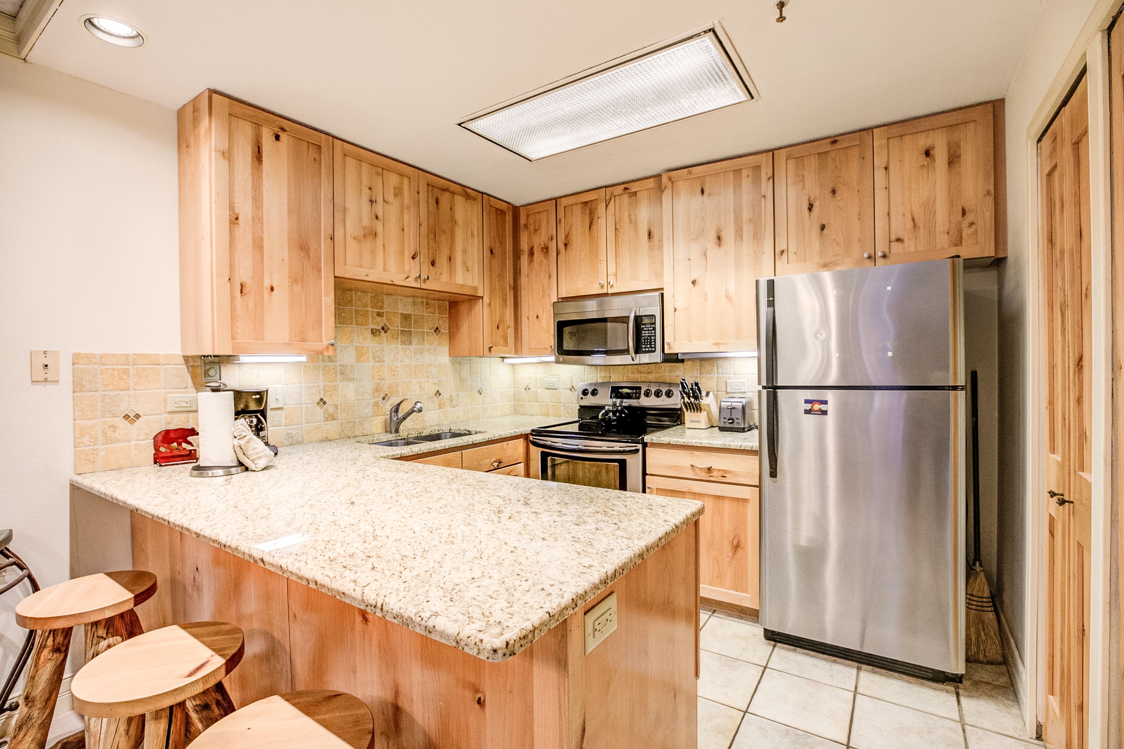 This 2-bedroom, 2-bathroom condo is a perfect year-round retreat for families or groups of up to 6 – and since both bedrooms are suites with private bathrooms, it’s also perfect for two couples to share. The living area has a large flat-screen TV, comfortable furnishings and a wood fireplace; it’s the perfect place to relax with your group after a long day of skiing, mountain biking, or exploring historic Main Street Breckenridge. The kitchen features granite counters and stainless-steel appliances, as well as all the gear you’ll need to whip up everything from après-ski snacks to full mountain meals. The dining area is just off the kitchen and has room for six at the dining room table, as well as three seats at the counter.