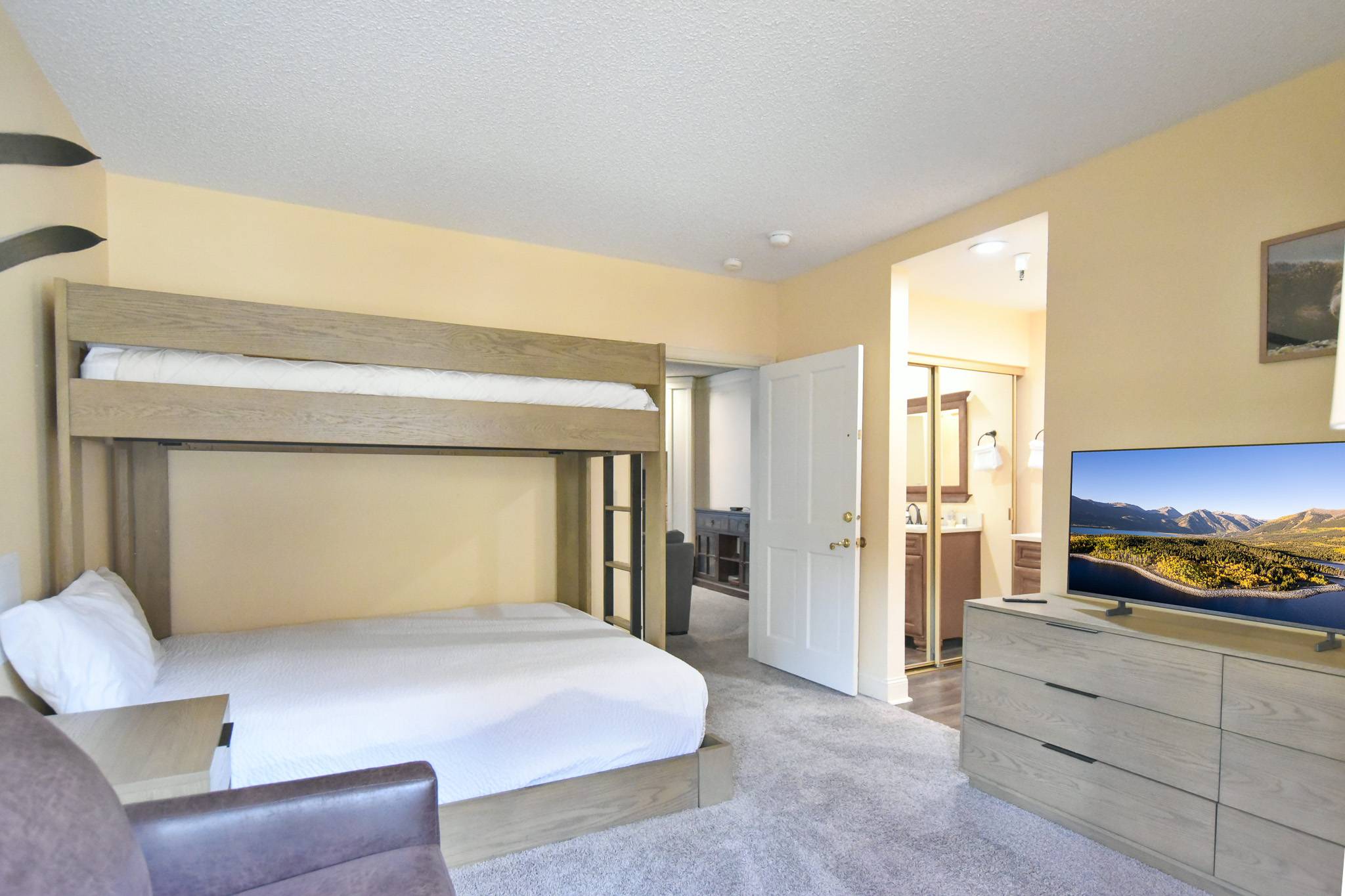 • Bunk Bed Suite: twin xl-over-queen bunk bed, single sleeper sofa, private bathroom with shower/tub smart tv. (sleeps 4)