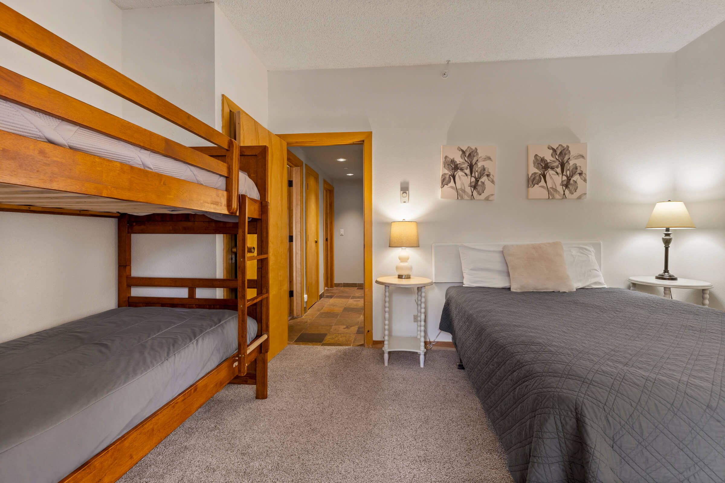 • Queen Bunk Bedroom: queen bed, twin-over-twin bunk bed, patio access. (sleeps 4)