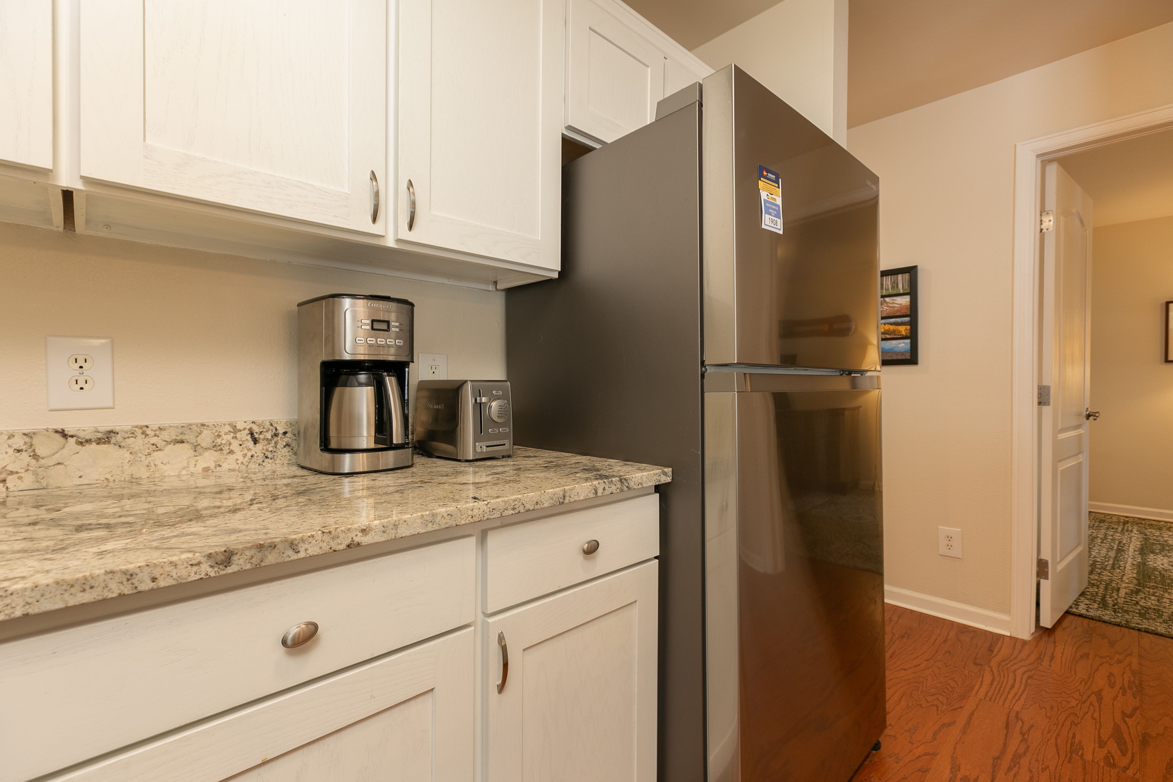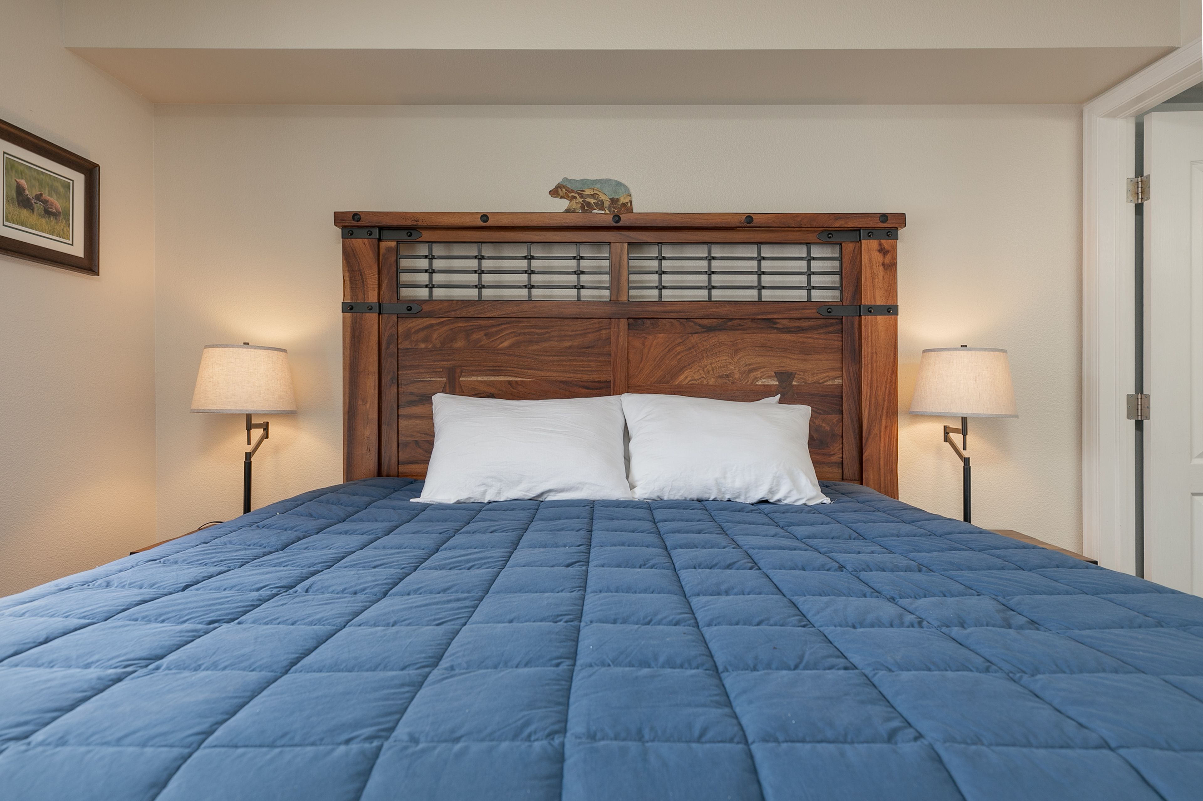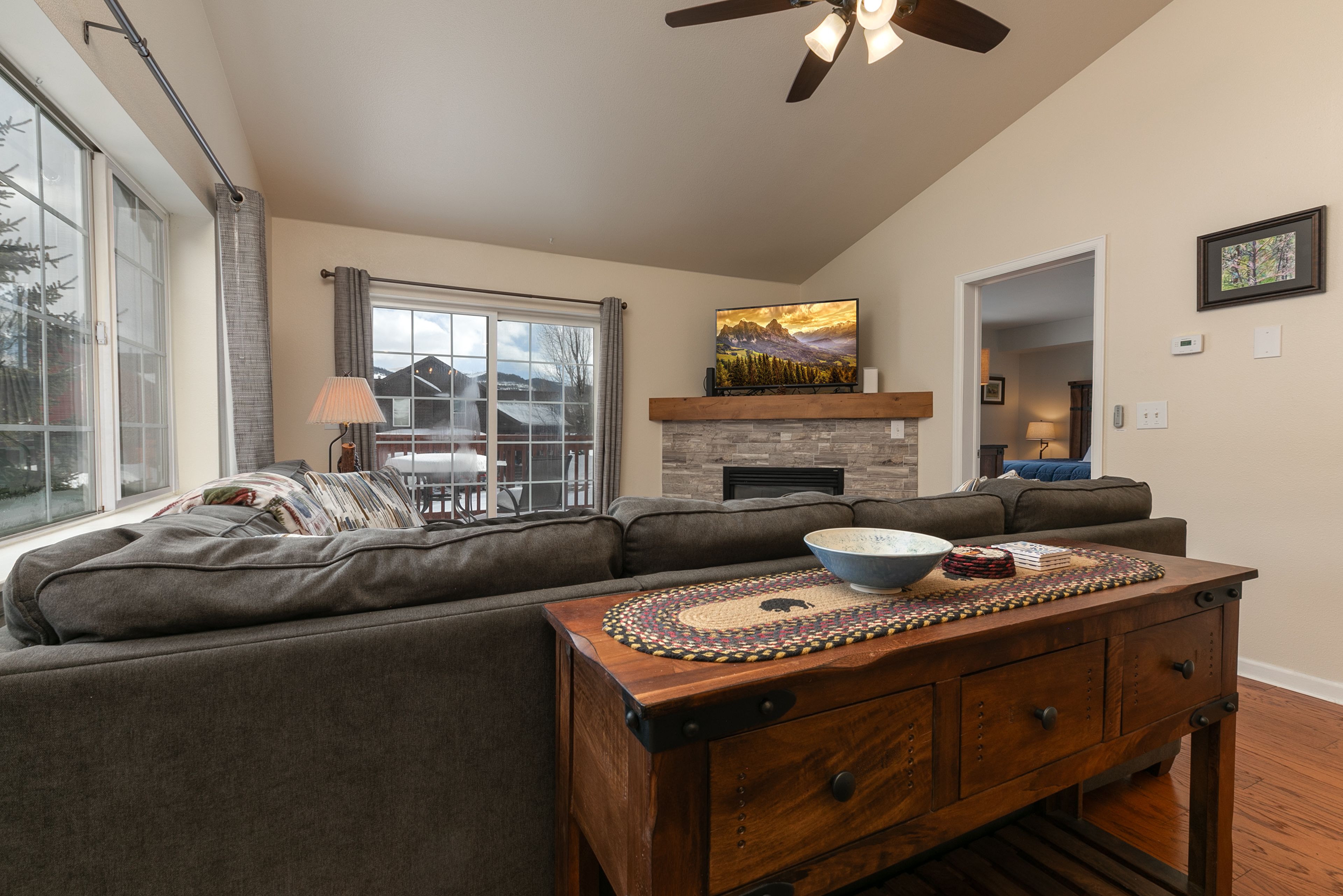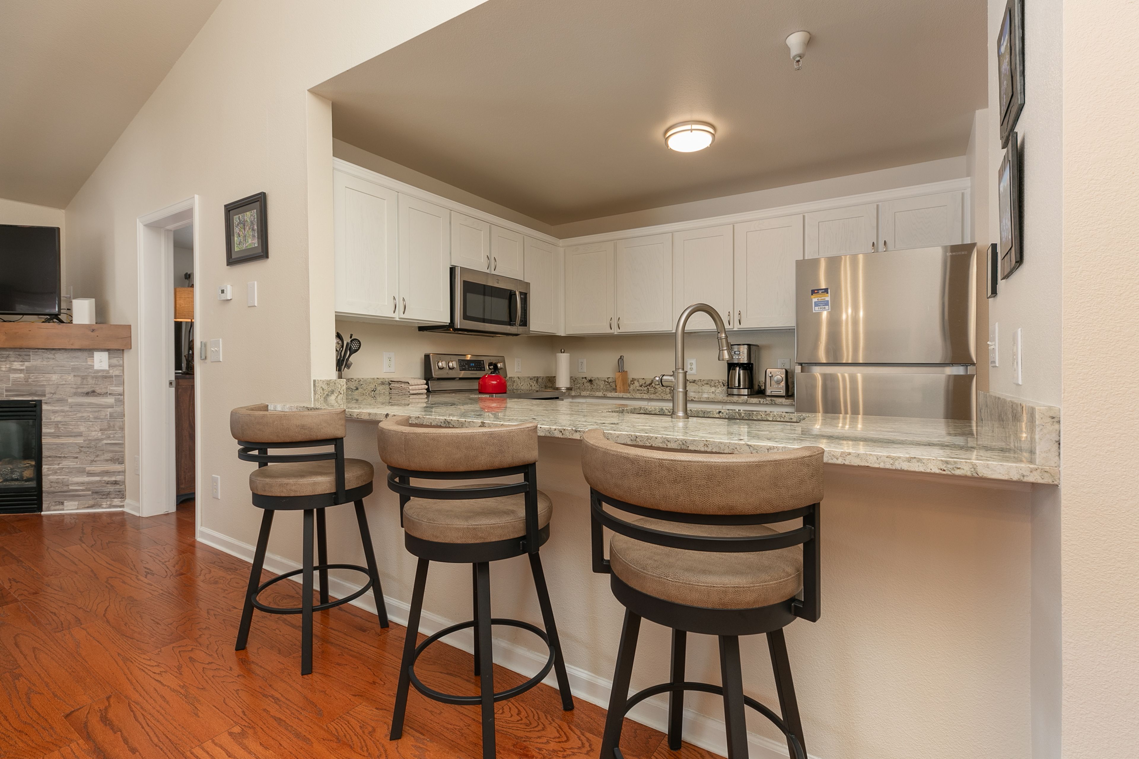 This warm and inviting two-bedroom, two-bathroom condo is perfect for groups up to six. The living area has large windows for lots of light, and there’s plenty of seating to in front of the flat-screen TV and gas fireplace. The fully equipped kitchen features stainless steel appliances and all the gear you’ll need to keep the troops happy and fed. The dining table seats four, and there’s room for three at the counter.