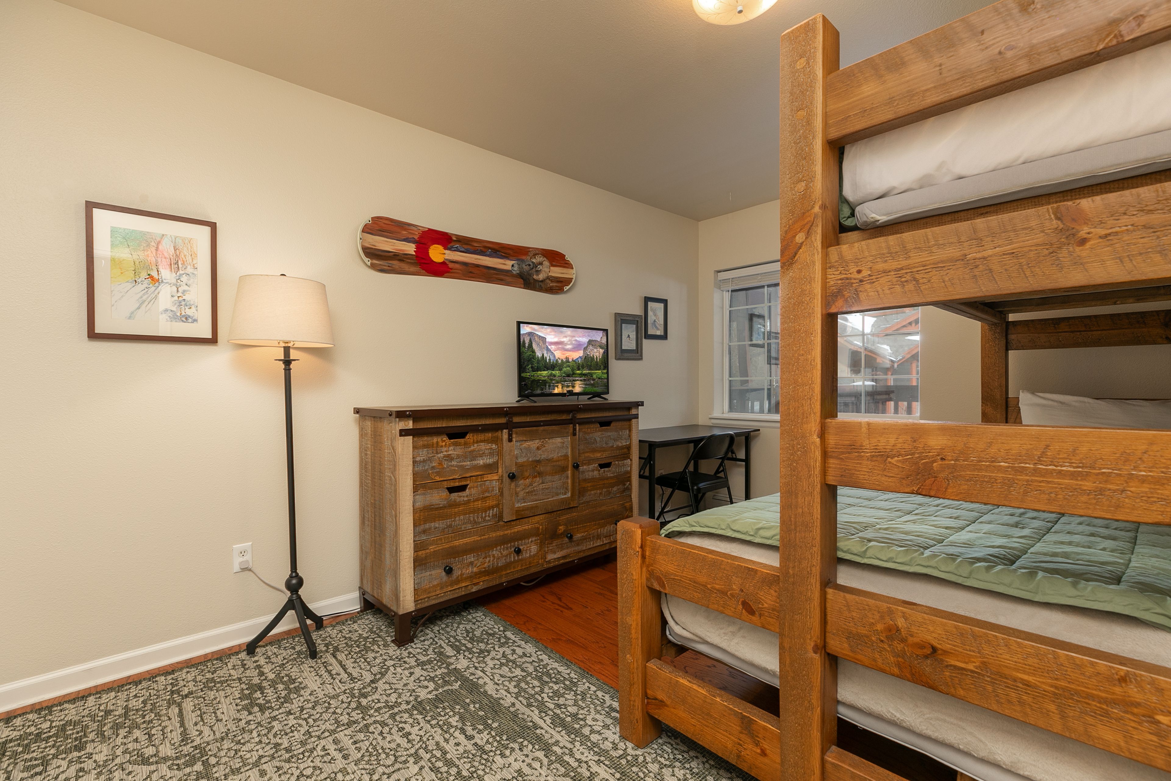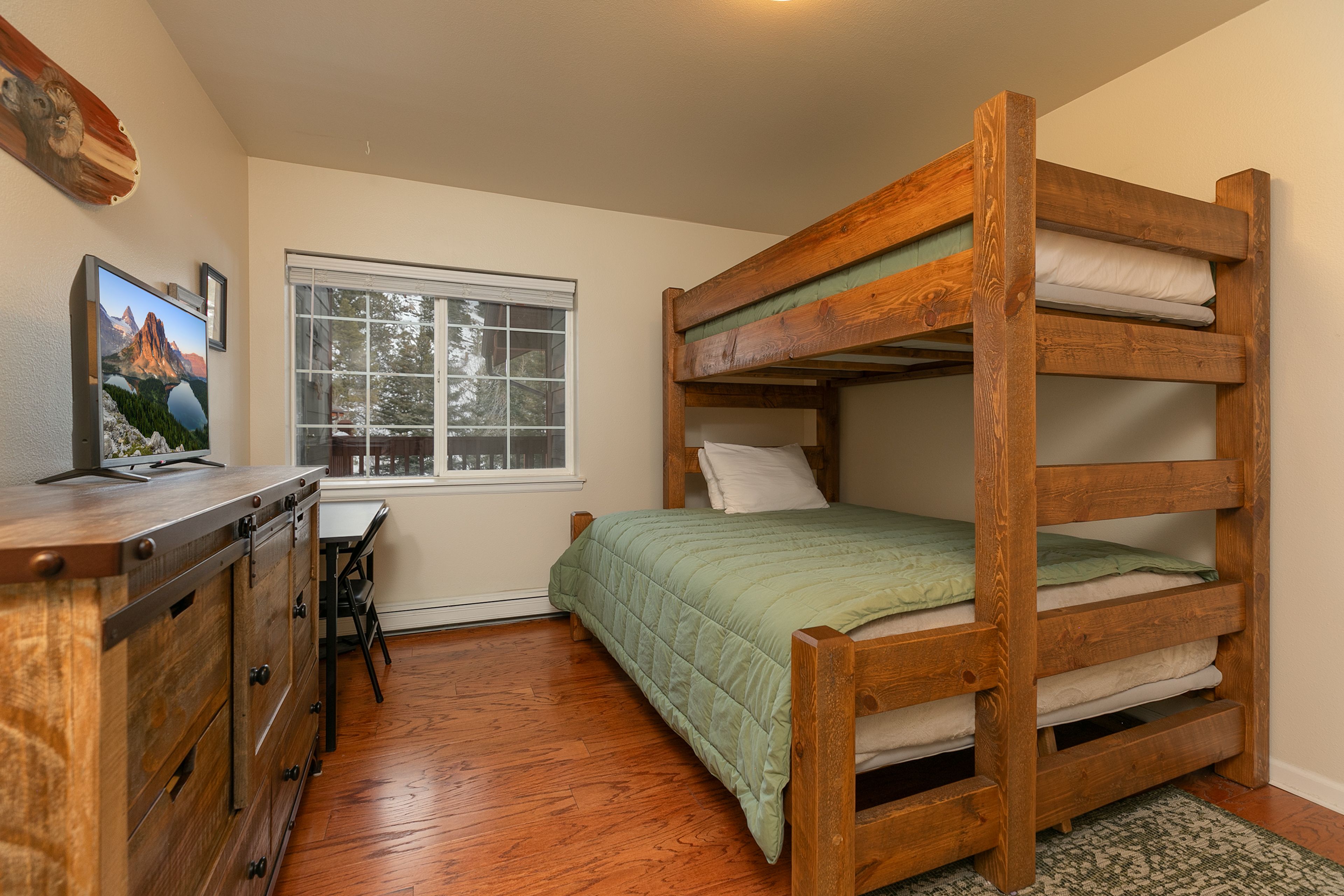 - Bedroom 2: twin-over-queen bunk bed, flat-screen TV.