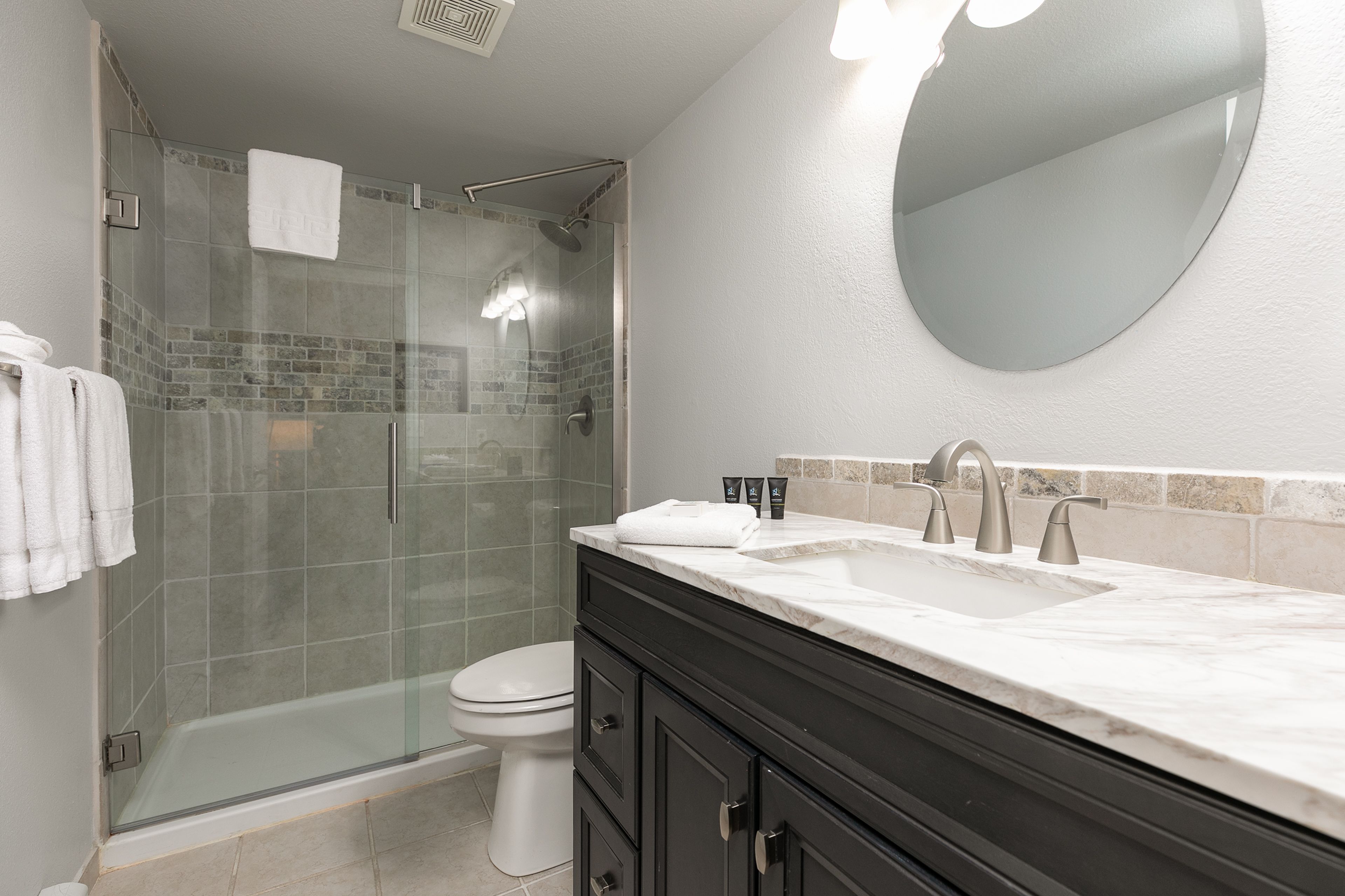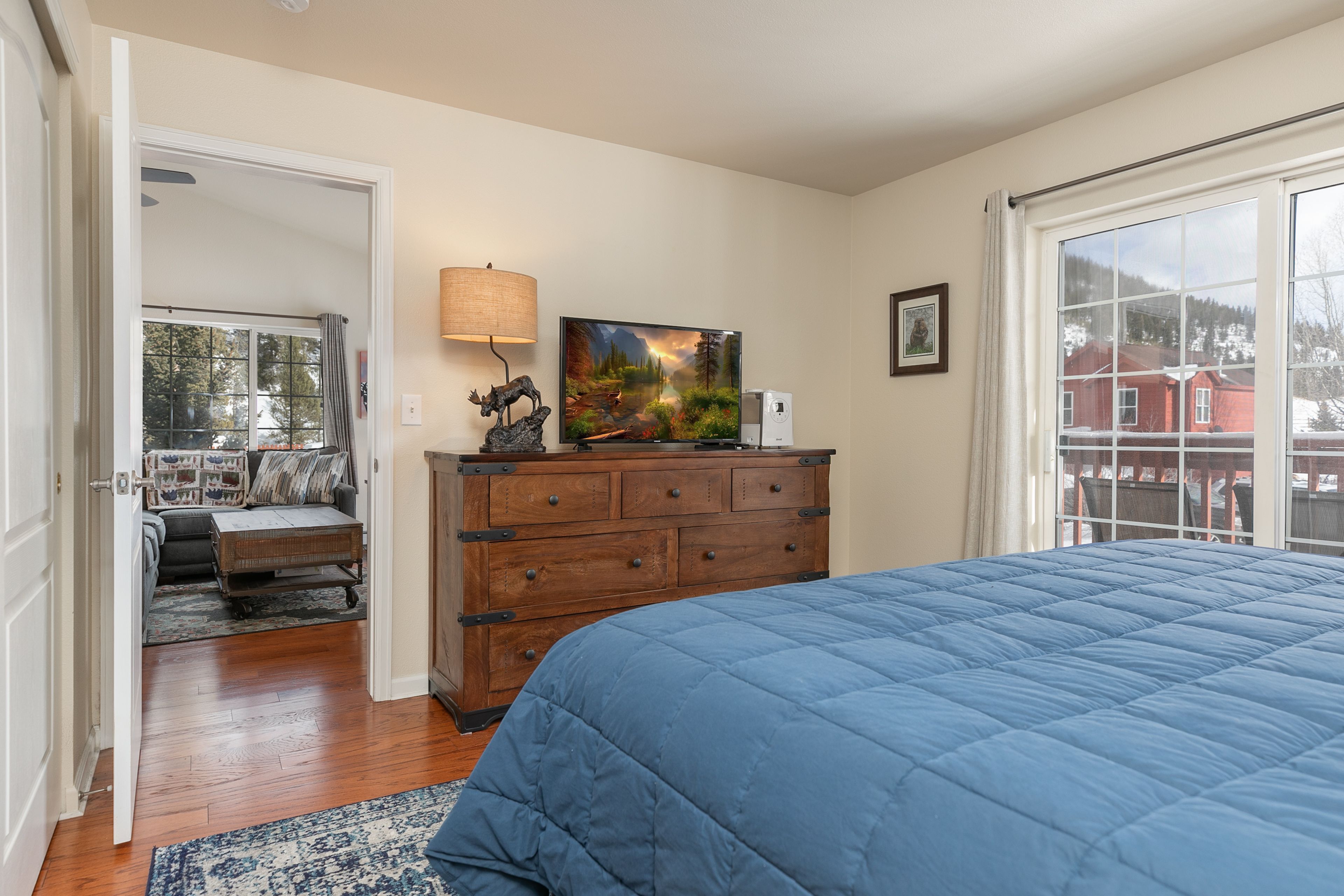 - Master suite: king bed, private bathroom with walk-in tile shower, flat-screen TV, private door to deck.