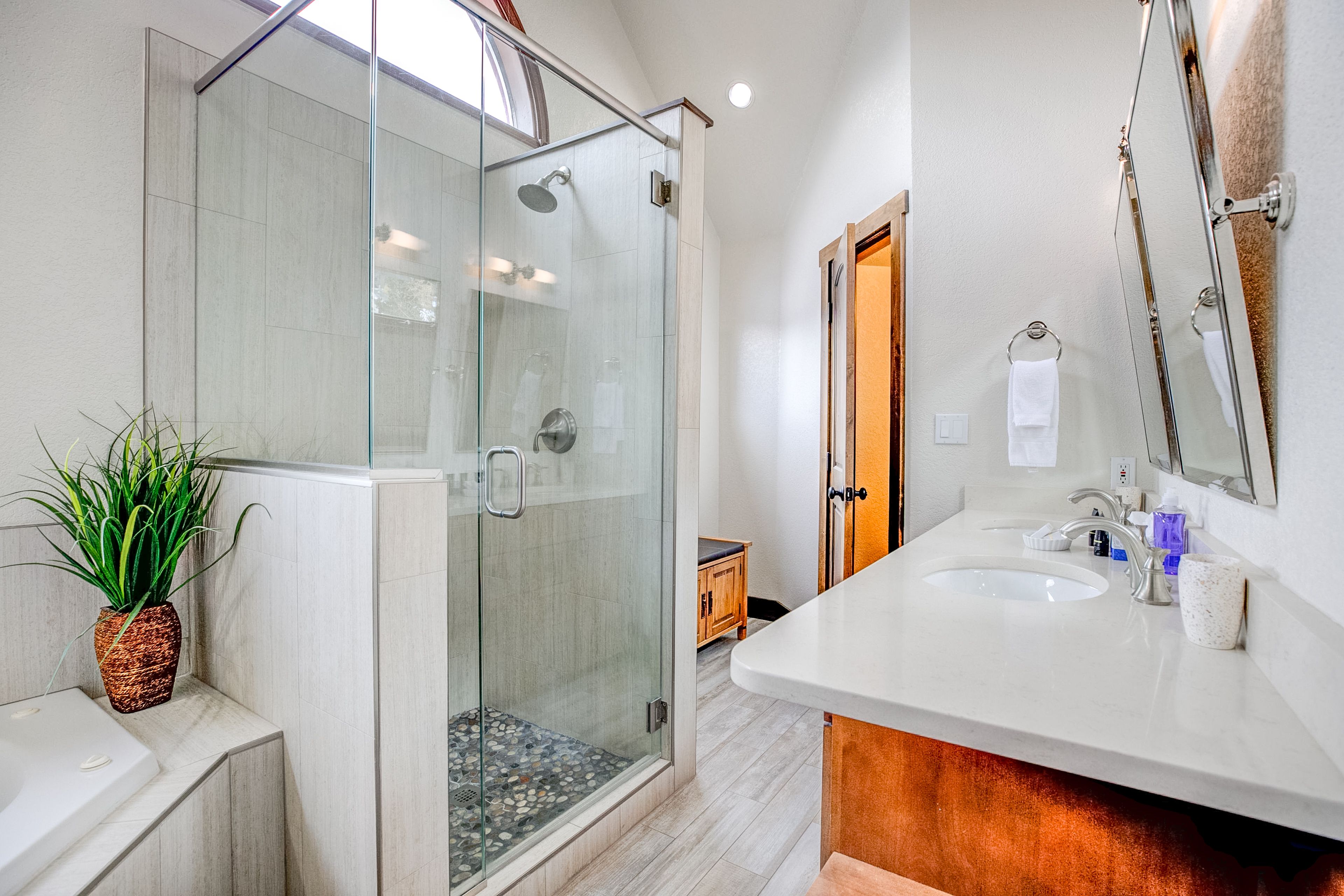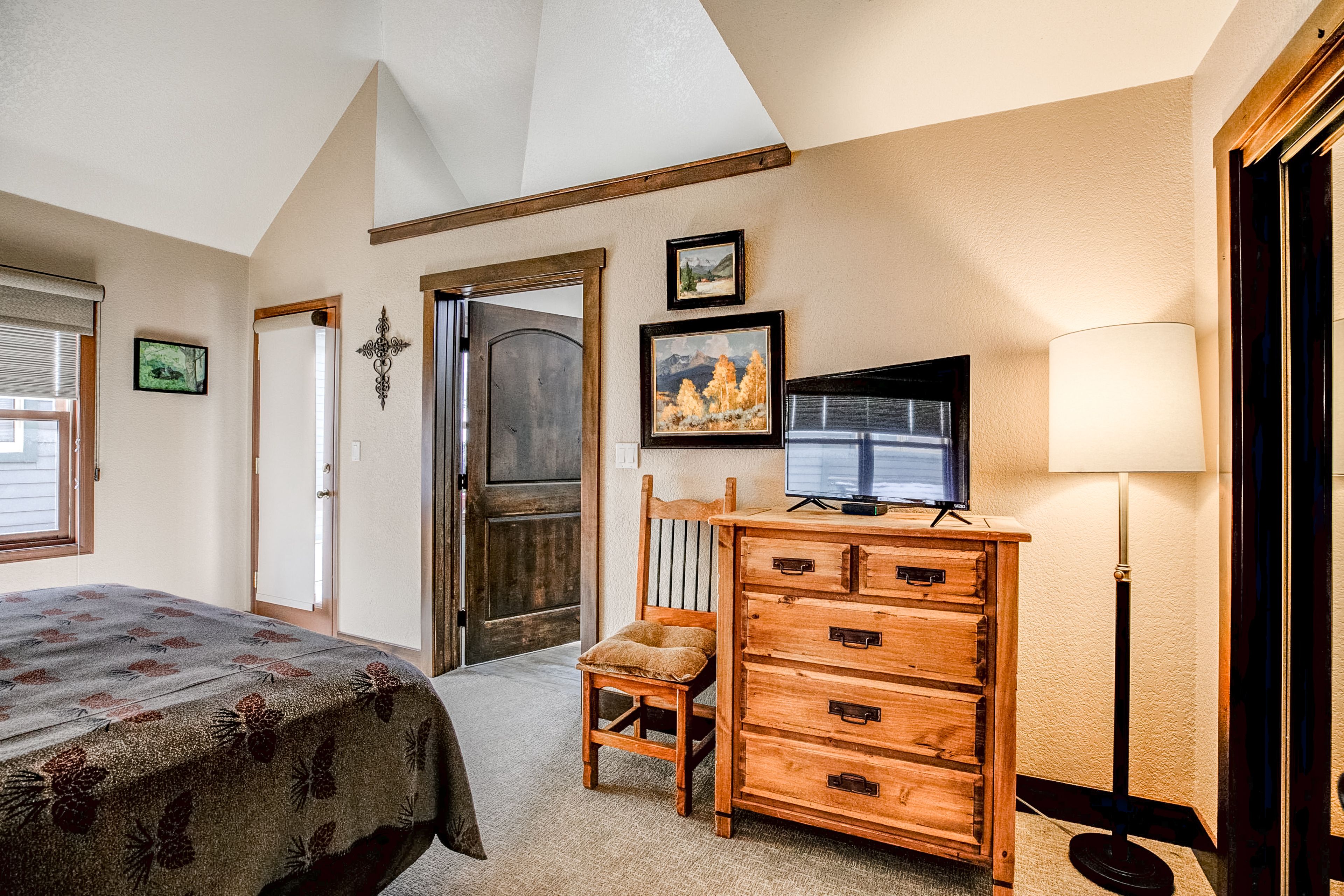 - Master suite: king bed, private bathroom with jetted soaking tub, walk-in tile shower, 2 sinks, flat-screen TV, private patio, slope views. (sleeps 2)