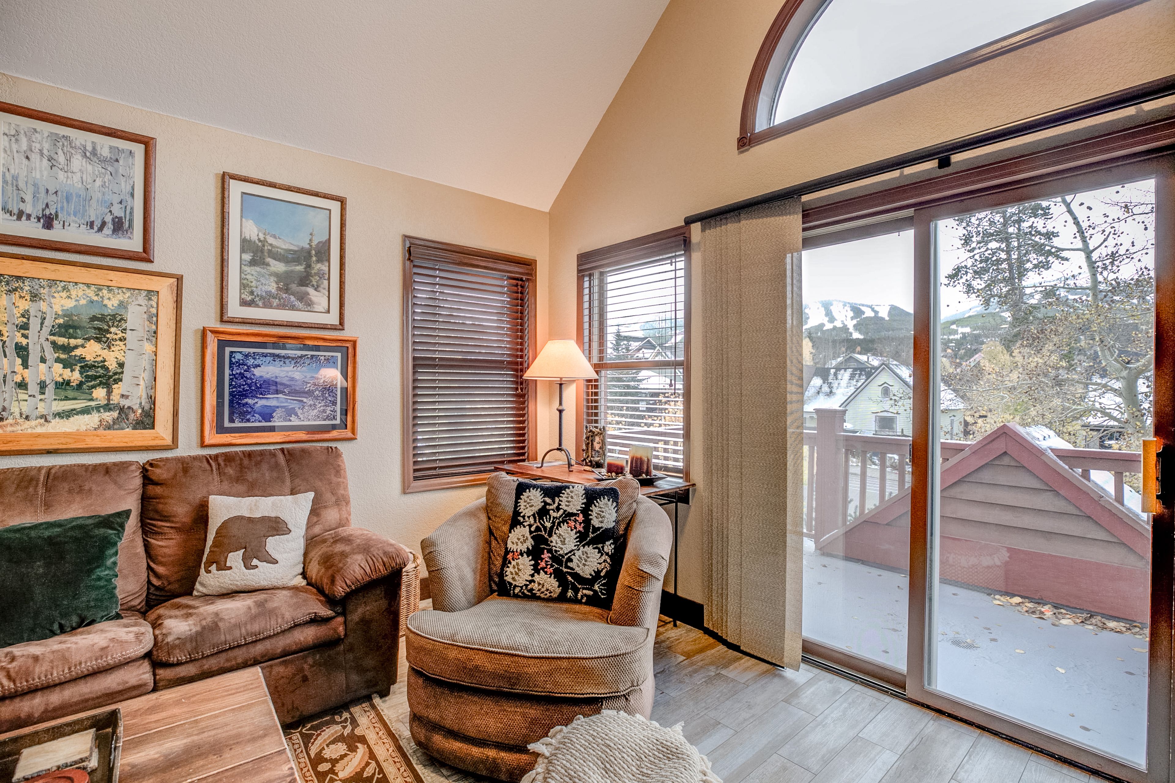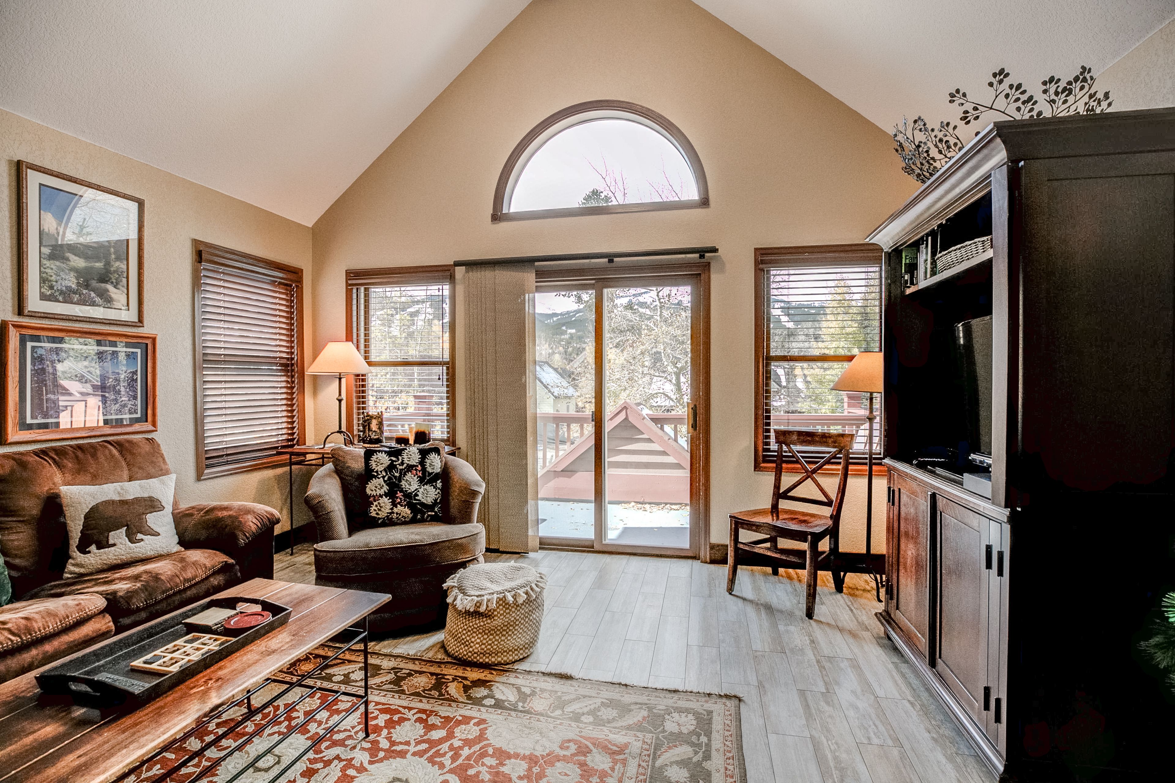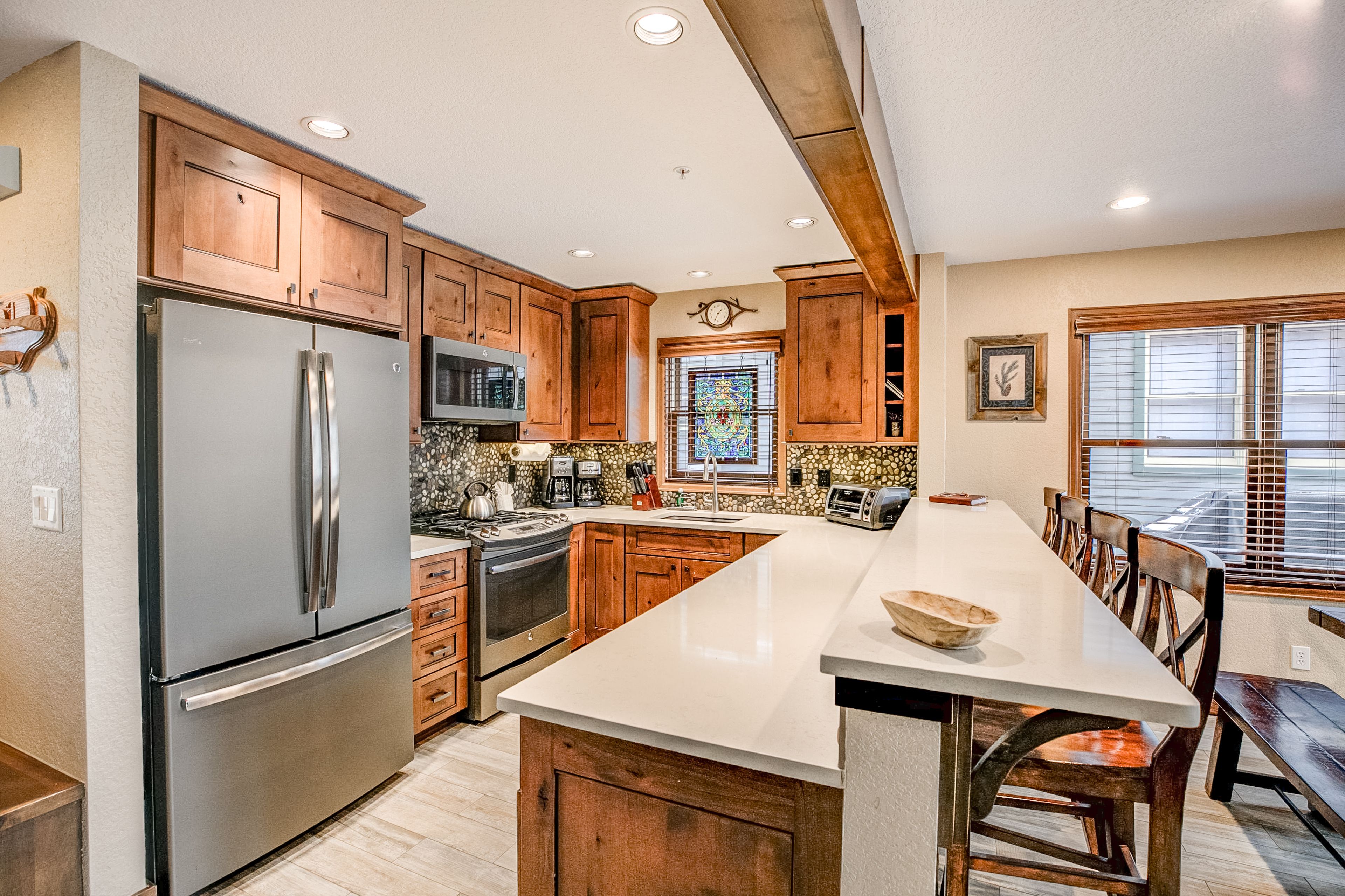 This 3-bedroom, 2.5-bathroom premium townhome is a fabulous retreat for groups of up to six people. The decks boast great views of Breckenridge Ski Resort and a gas grill, and you’ll love taking a dip in the private hot tub after a long day on the slopes. The living area features vaulted ceilings, great natural light, and views of the slopes. There’s also plenty of seating, a floor-to-ceiling rock gas fireplace, and a flat-screen TV. The updated kitchen features quartz counters, stainless steel appliances (including a gas range) and all the gear you’ll need to whip up everything from apres-ski snacks to memorable mountain meals. The dining table seats six, and there’s room for four more at the breakfast bar.