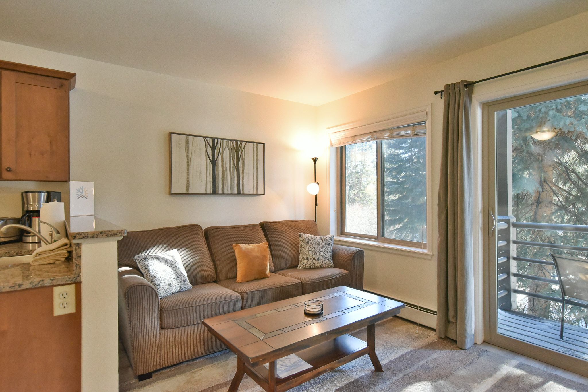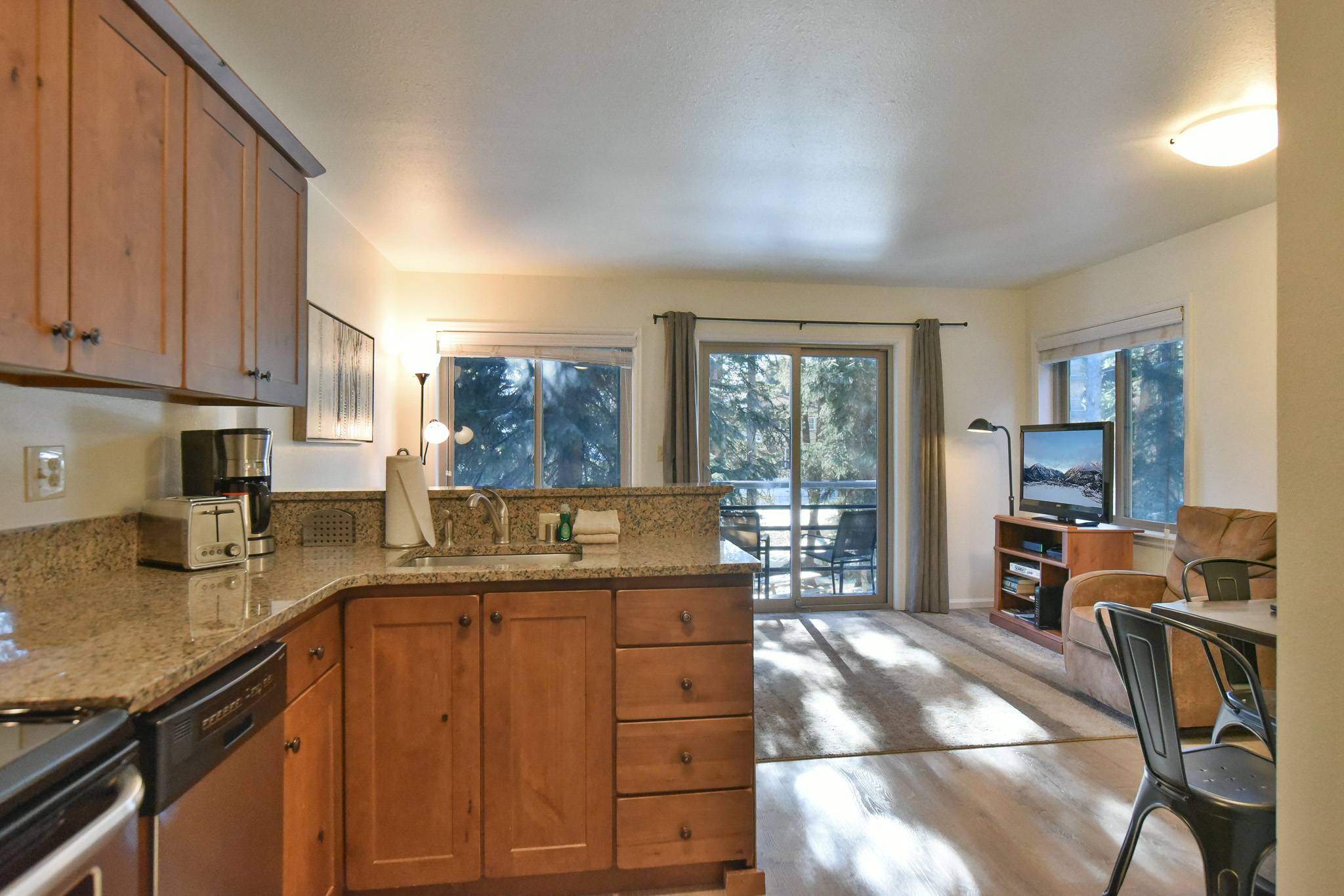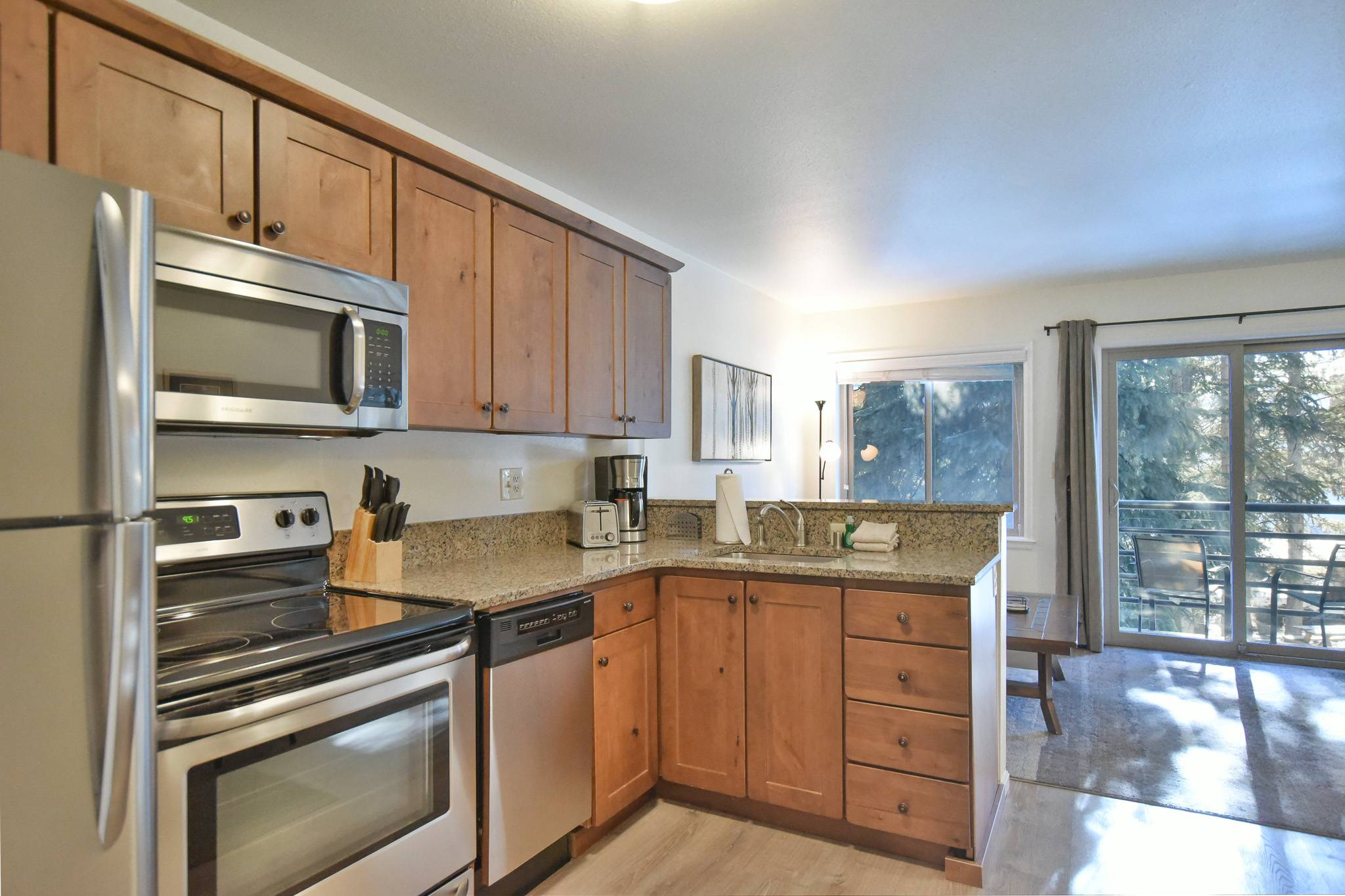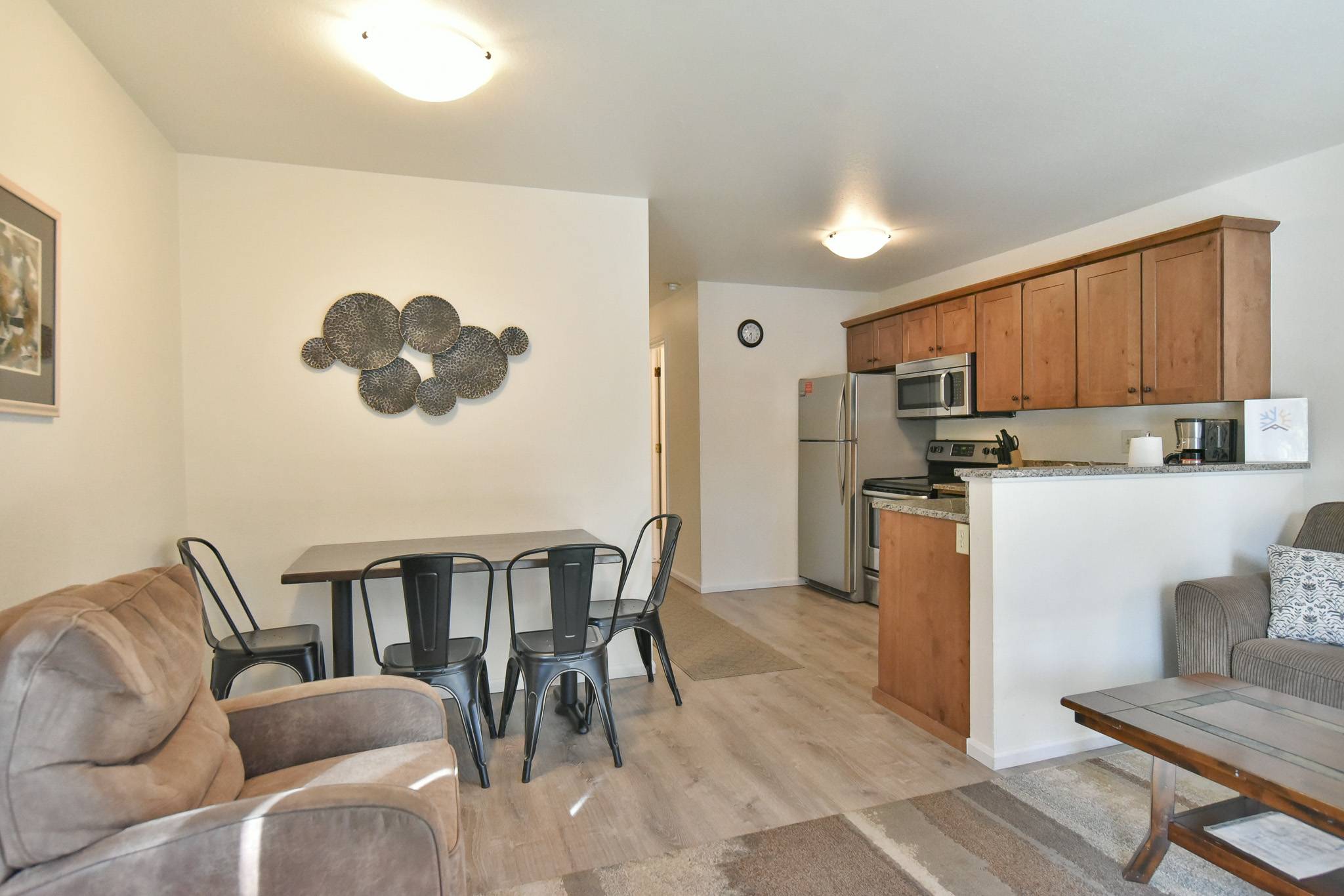 This 1-bedroom, 1-bathroom condo is the perfect home base for up to four guests. The inviting living area features a comfortable sofa and a flat-screen TV, ideal for cozy evenings after a day of alpine exploration. The updated kitchen comes equipped with stainless steel appliances and all the essentials to whip up meals at home. Share stories from the day over dinner at the dining table, then step outside to your private balcony—set just above the babbling brook and close to the shared hot tub—for a dose of fresh air and mountain ambiance.