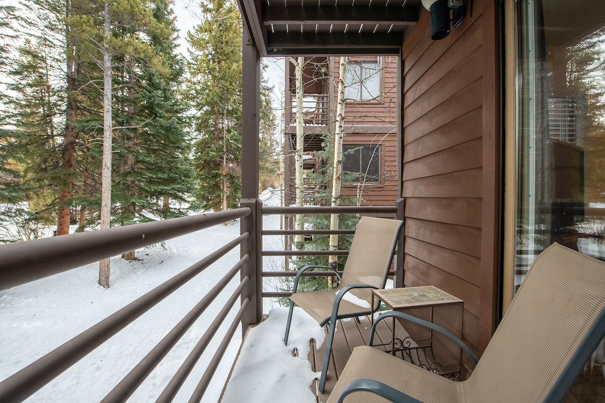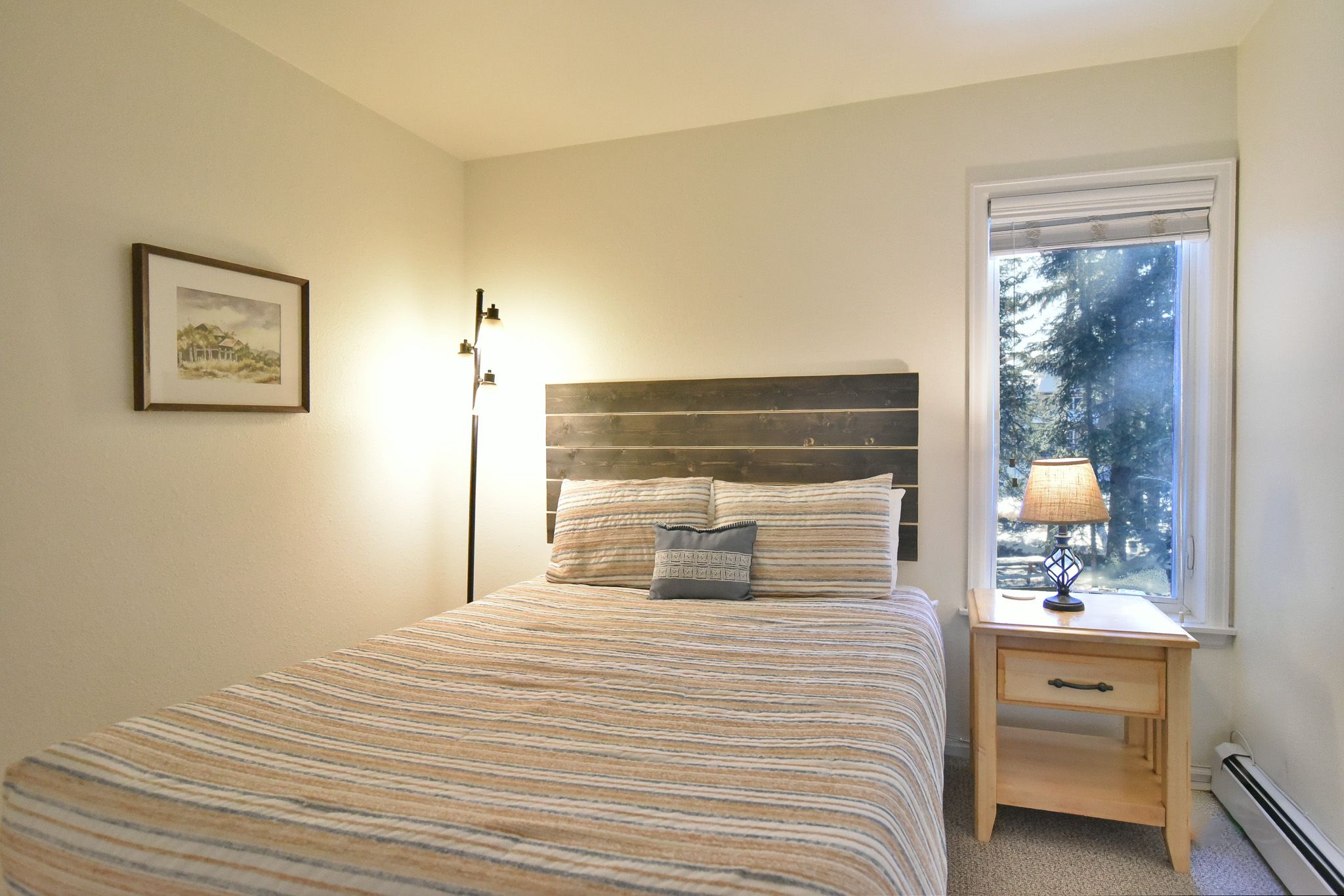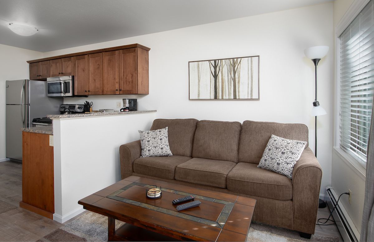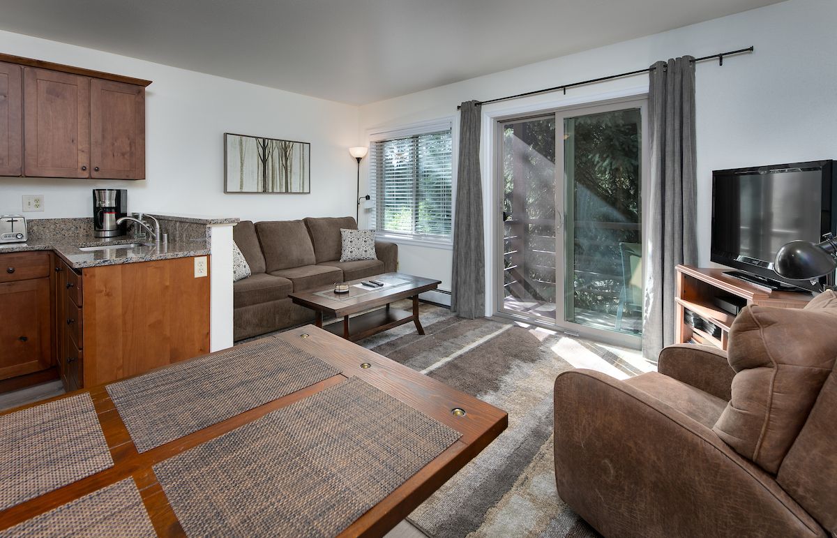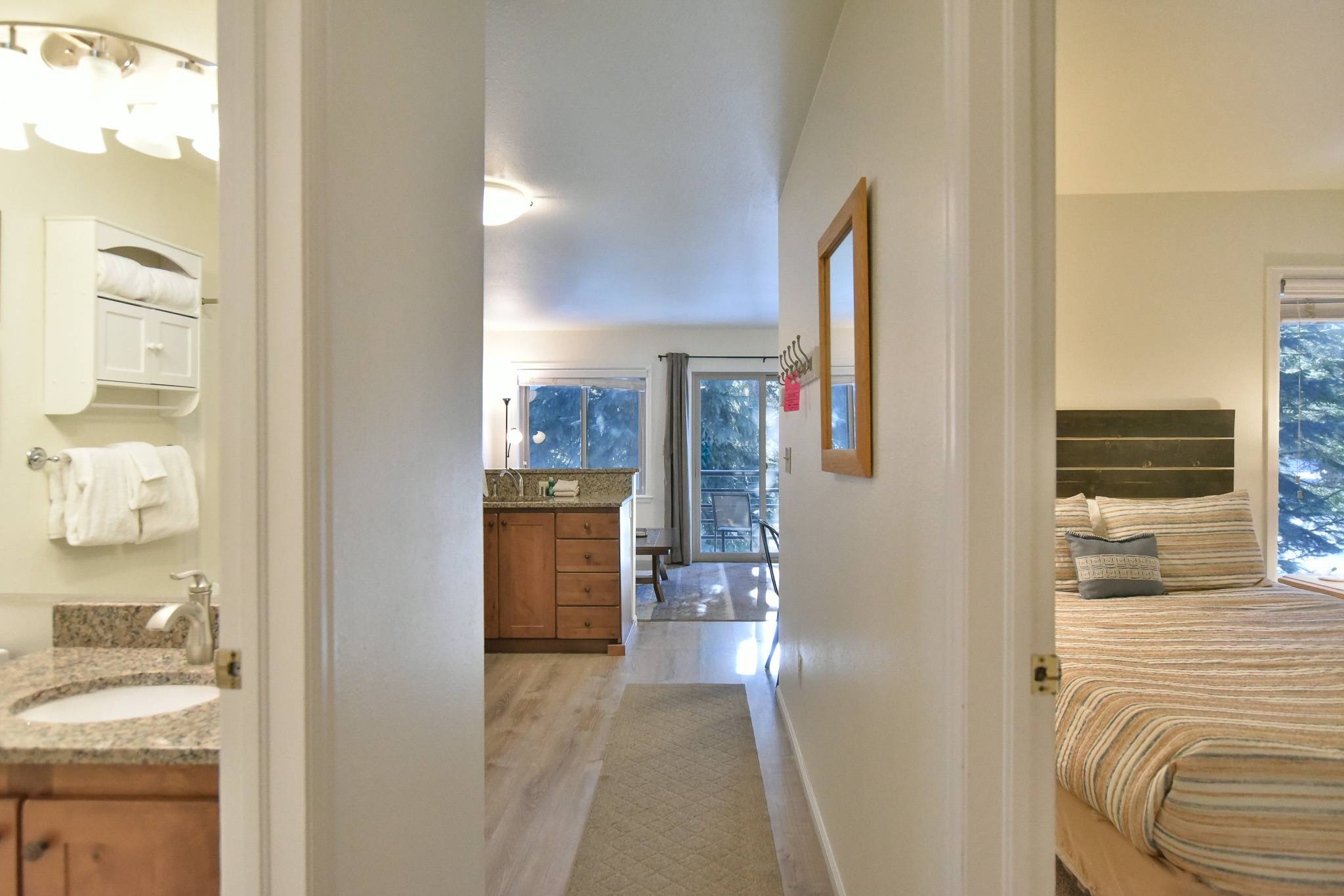 This 1-bedroom, 1-bathroom condo is the perfect home base for up to four guests. The inviting living area features a comfortable sofa and a flat-screen TV, ideal for cozy evenings after a day of alpine exploration. The updated kitchen comes equipped with stainless steel appliances and all the essentials to whip up meals at home. Share stories from the day over dinner at the dining table, then step outside to your private balcony—set just above the babbling brook and close to the shared hot tub—for a dose of fresh air and mountain ambiance.
