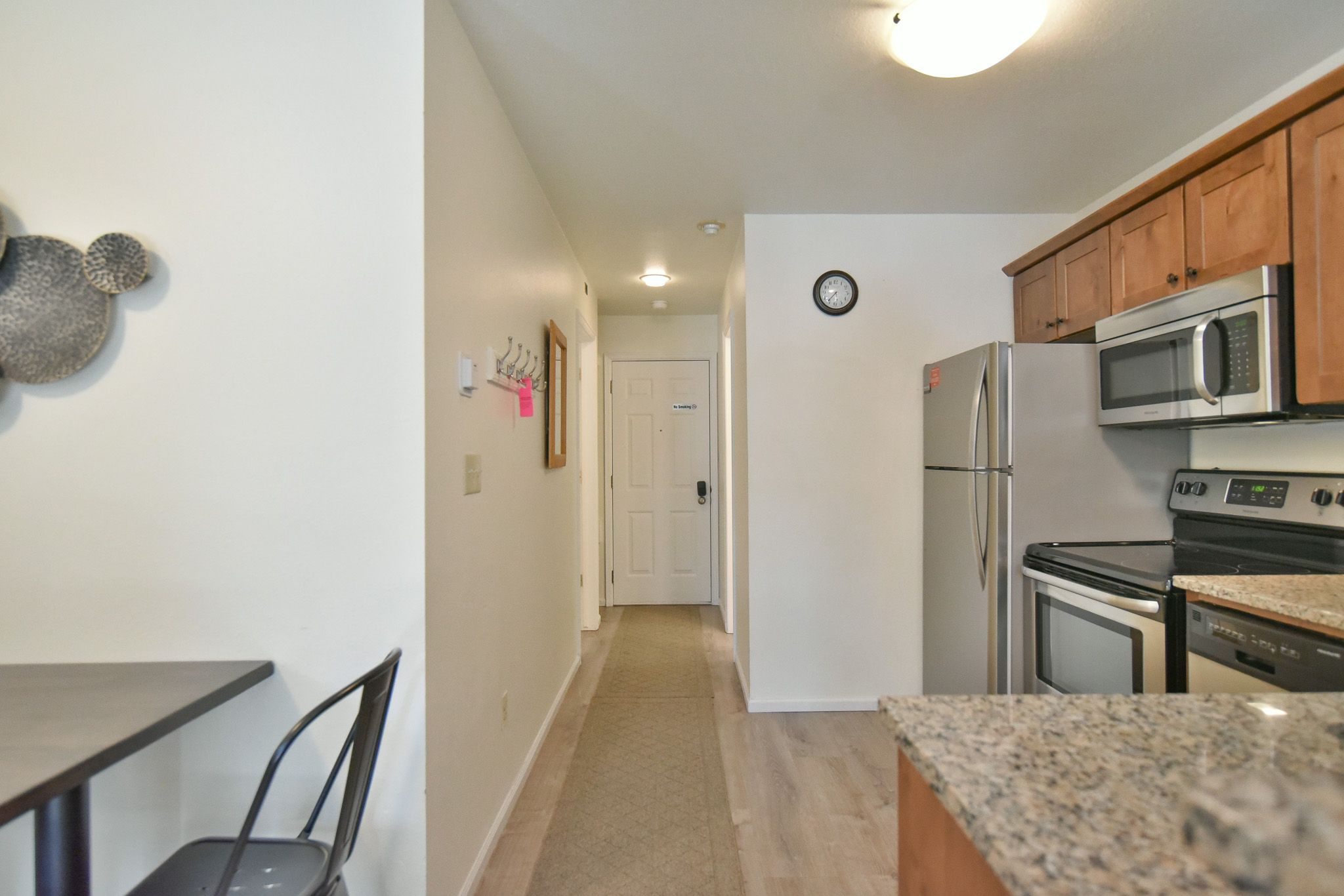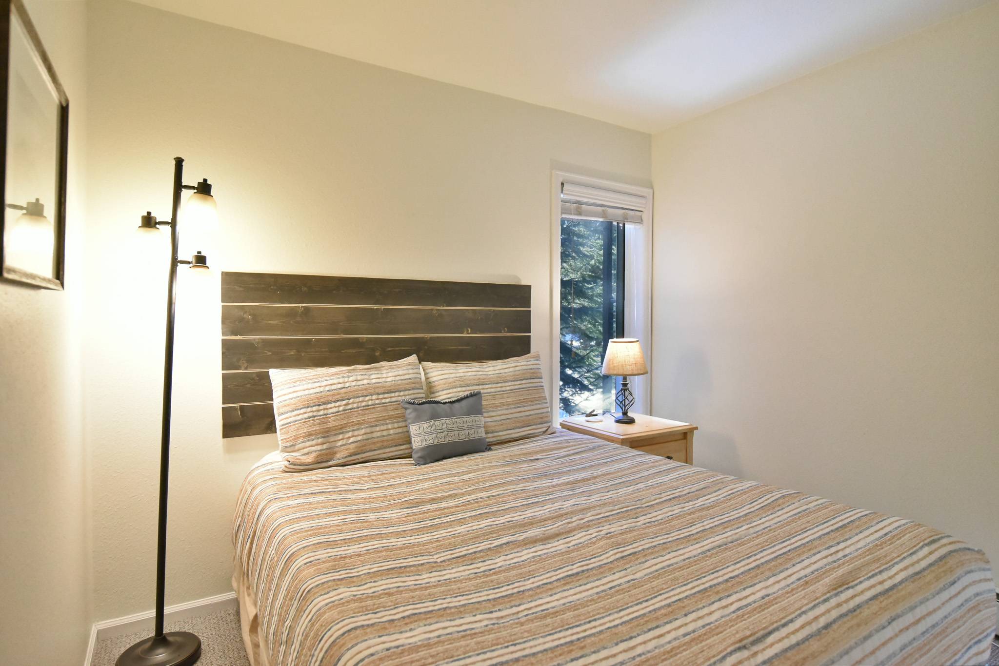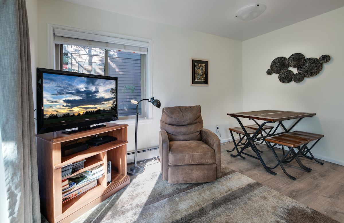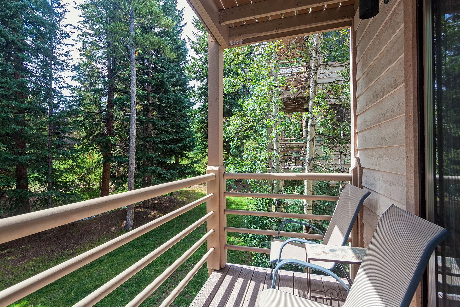 This 1-bedroom, 1-bathroom condo is the perfect home base for up to four guests. The inviting living area features a comfortable sofa and a flat-screen TV, ideal for cozy evenings after a day of alpine exploration. The updated kitchen comes equipped with stainless steel appliances and all the essentials to whip up meals at home. Share stories from the day over dinner at the dining table, then step outside to your private balcony—set just above the babbling brook and close to the shared hot tub—for a dose of fresh air and mountain ambiance.