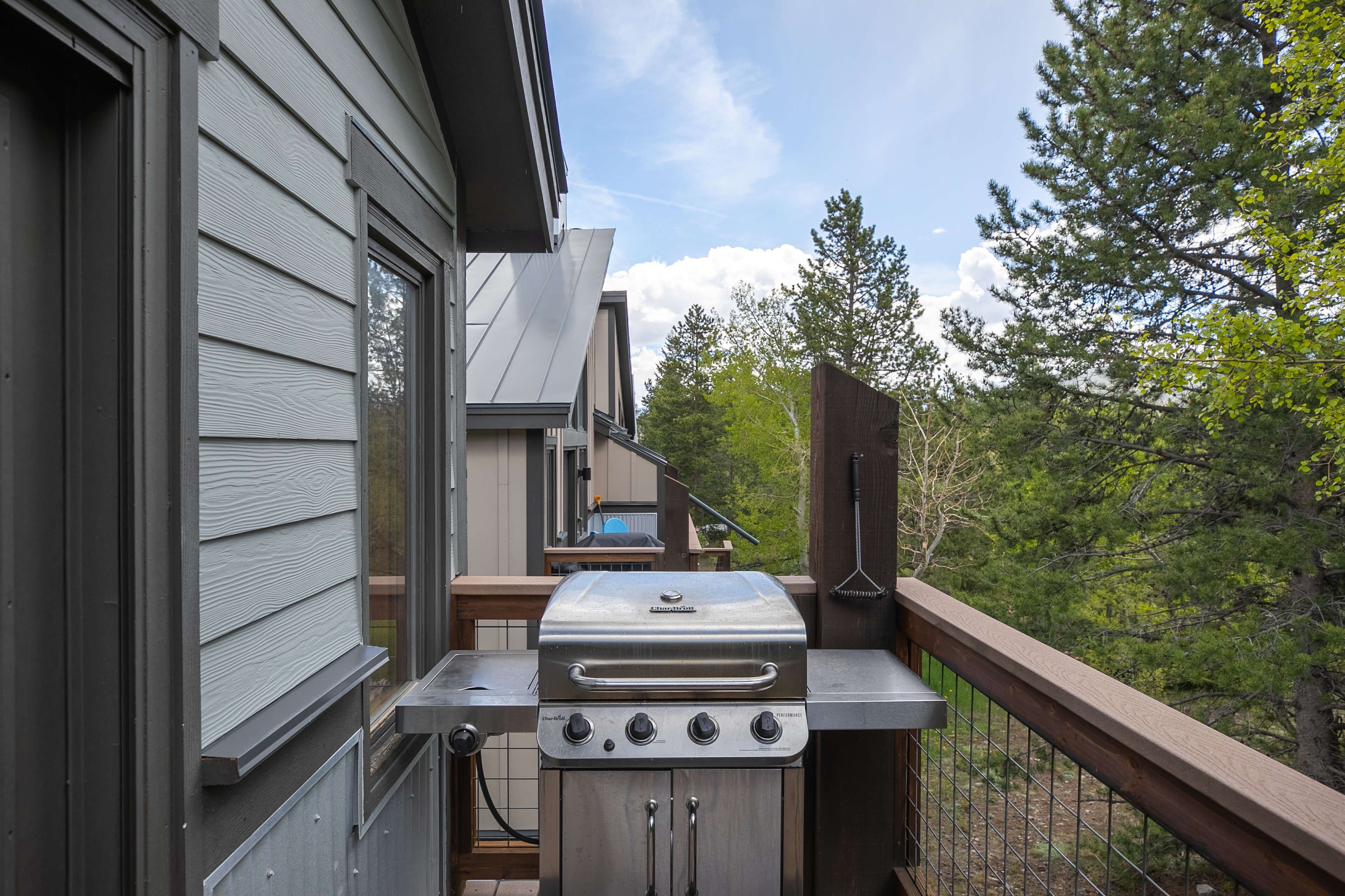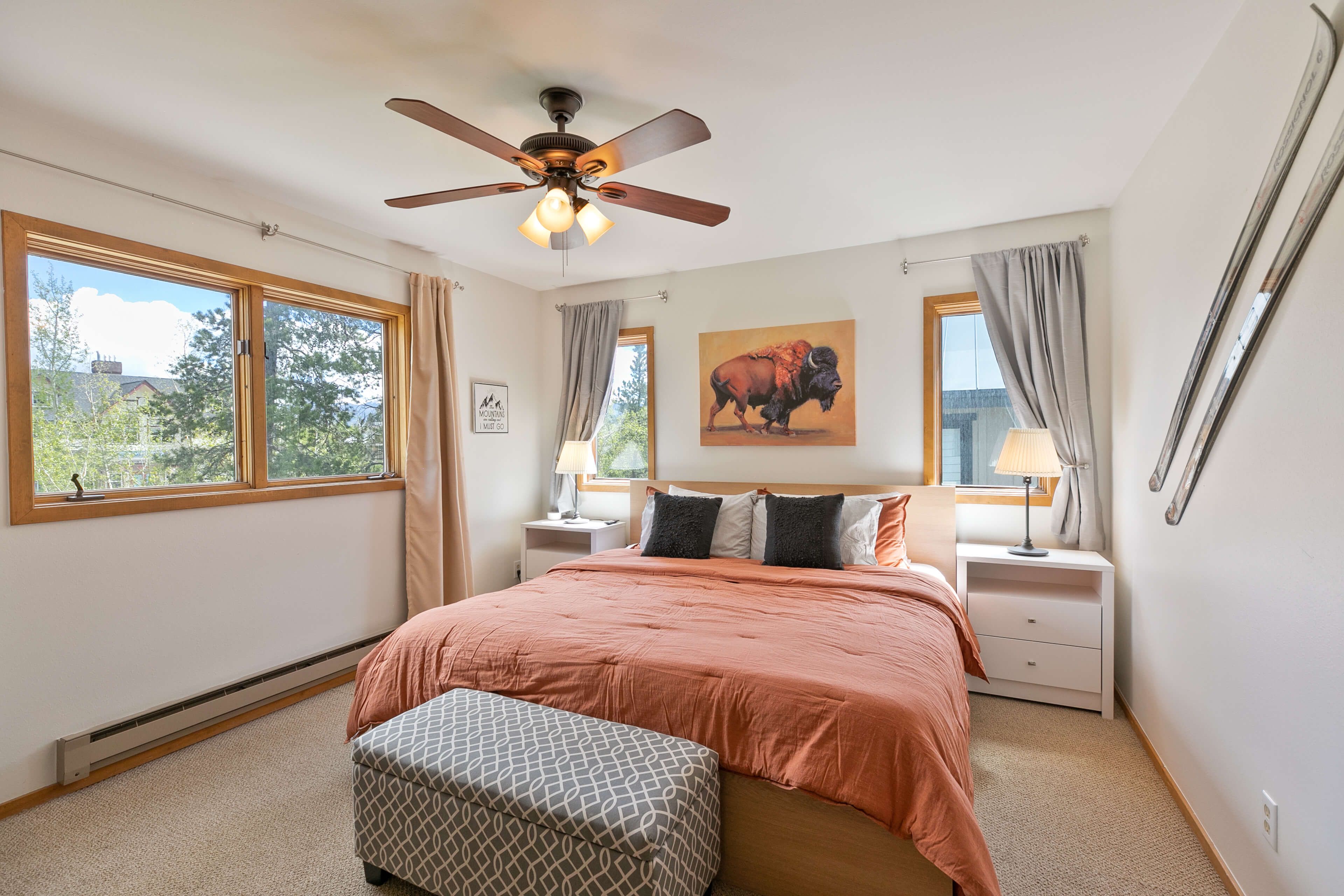 The 2-bedroom, 2-bathroom deluxe townhome works perfectly for families or groups of up to eight people. The living area is bright and airy with large windows, a floor-to-ceiling stone wood fireplace, and a large flat-screen TV. Just outside, the patio overlooks the bike path and creek; there’s also a gas grill and great views of Frisco’s Mount Royal. The kitchen features large quartz counters, stainless-steel appliances, and all the gear you’ll need to whip up meals and snacks for your group. The dining table seats six, and there’s room for two more at the counter.
