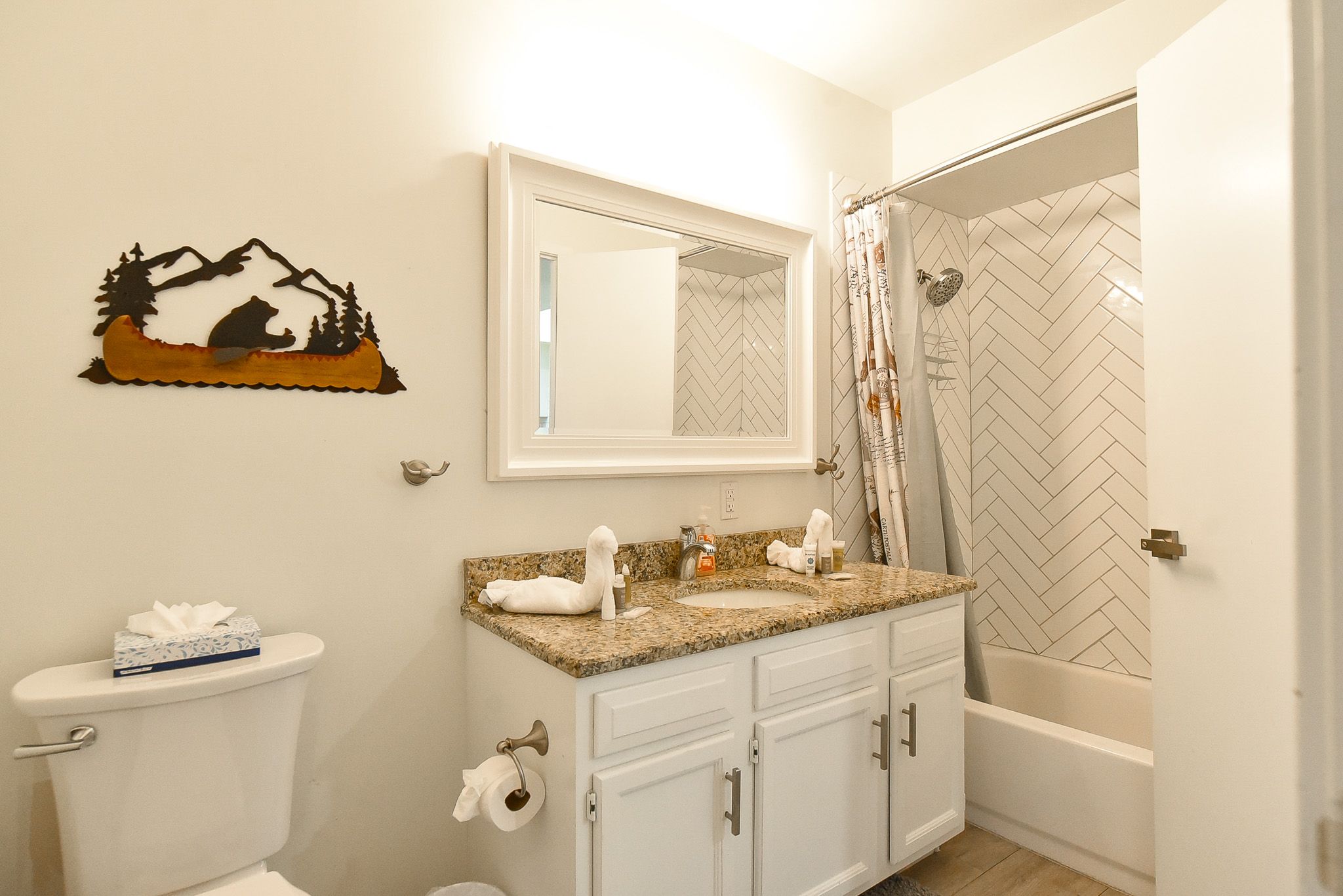 Upstairs, you’ll find the inviting king master bedroom with a shared ensuite bathroom featuring a shower/tub combo. This bedroom also includes a dedicated workspace and mountain views—ideal for remote workers or anyone wanting to stay connected while away. A sleeper sofa in the upper living area provides extra sleeping space for guests. On the lower level, the second bedroom includes a queen bed and twin bunk bed, Smart TV, and access to a private lower patio, as well as a nearby full bathroom with shower and a full-size washer and dryer for added convenience.
