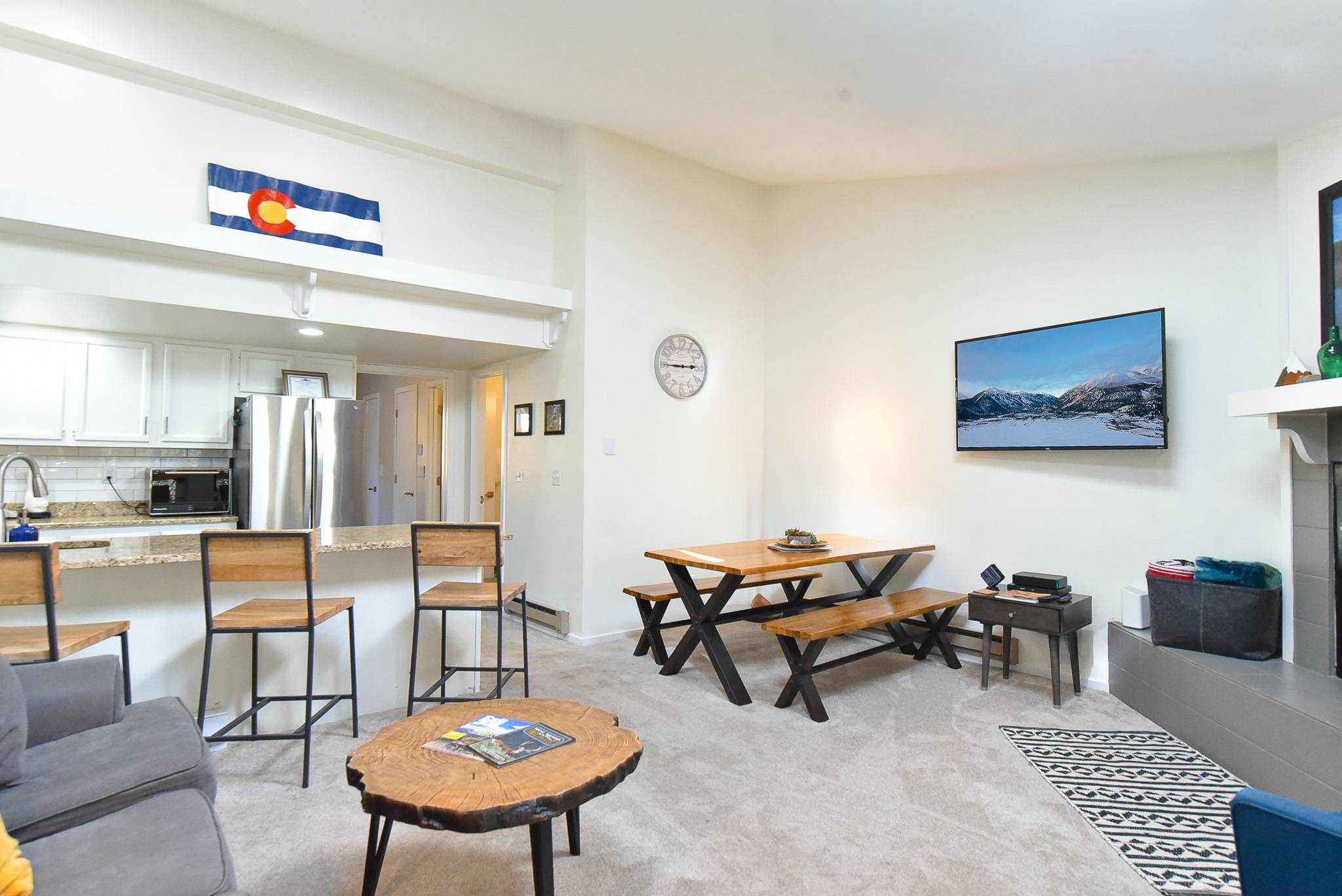 Windwood Bluebird Townhome offers the perfect blend of comfort, convenience, and mountain charm in the heart of Frisco. This recently renovated 2-bedroom, 2-bathroom townhome sleeps up to eight guests and is the ideal retreat for families or groups looking to explore Summit County in every season. With vaulted ceilings, a warm wood-burning fireplace, and private patios surrounded by fresh alpine air, you’ll feel right at home from the moment you arrive. (Please note: guests must provide their own firewood.)