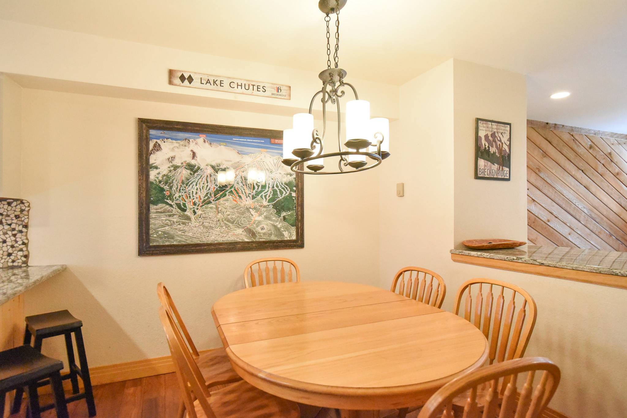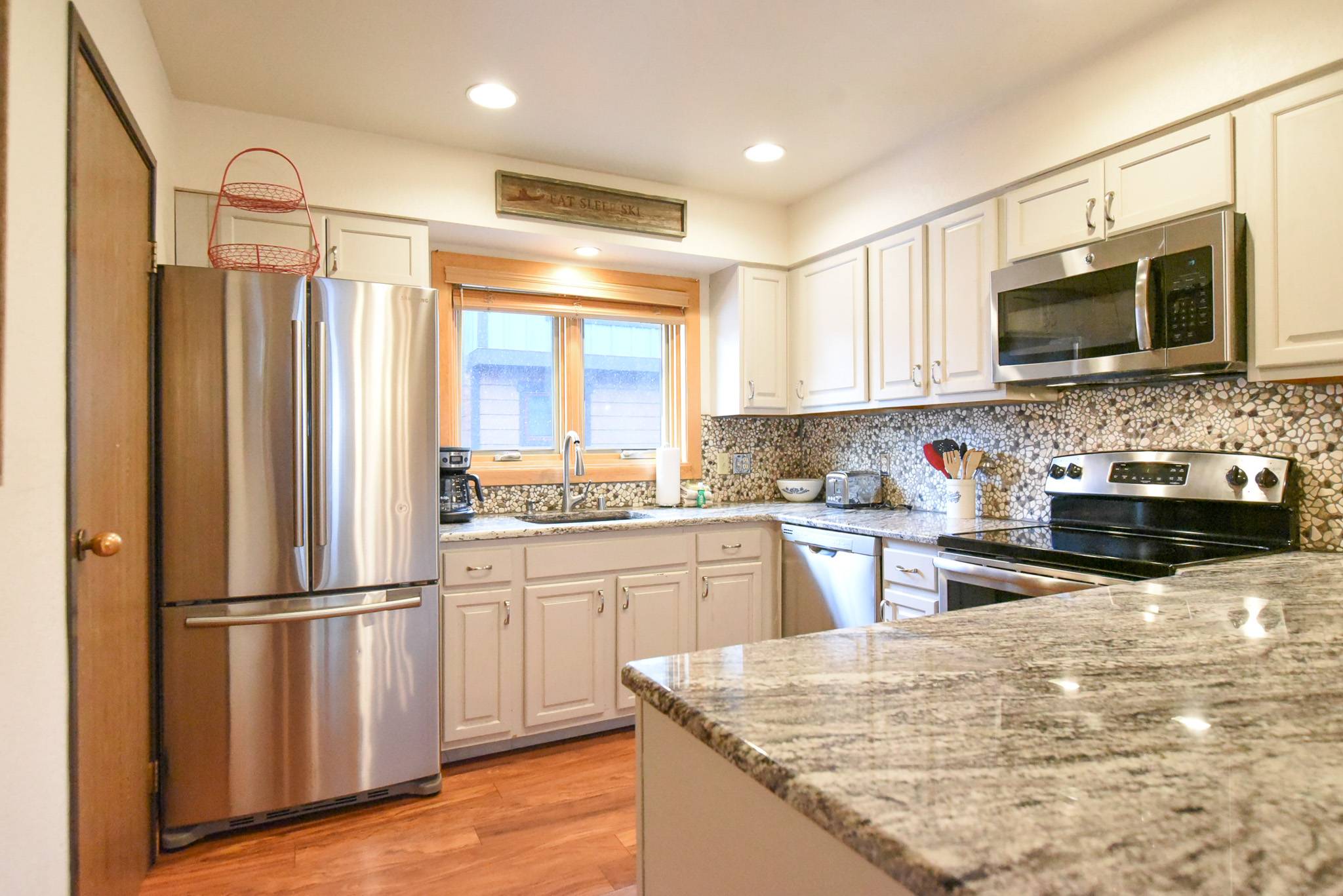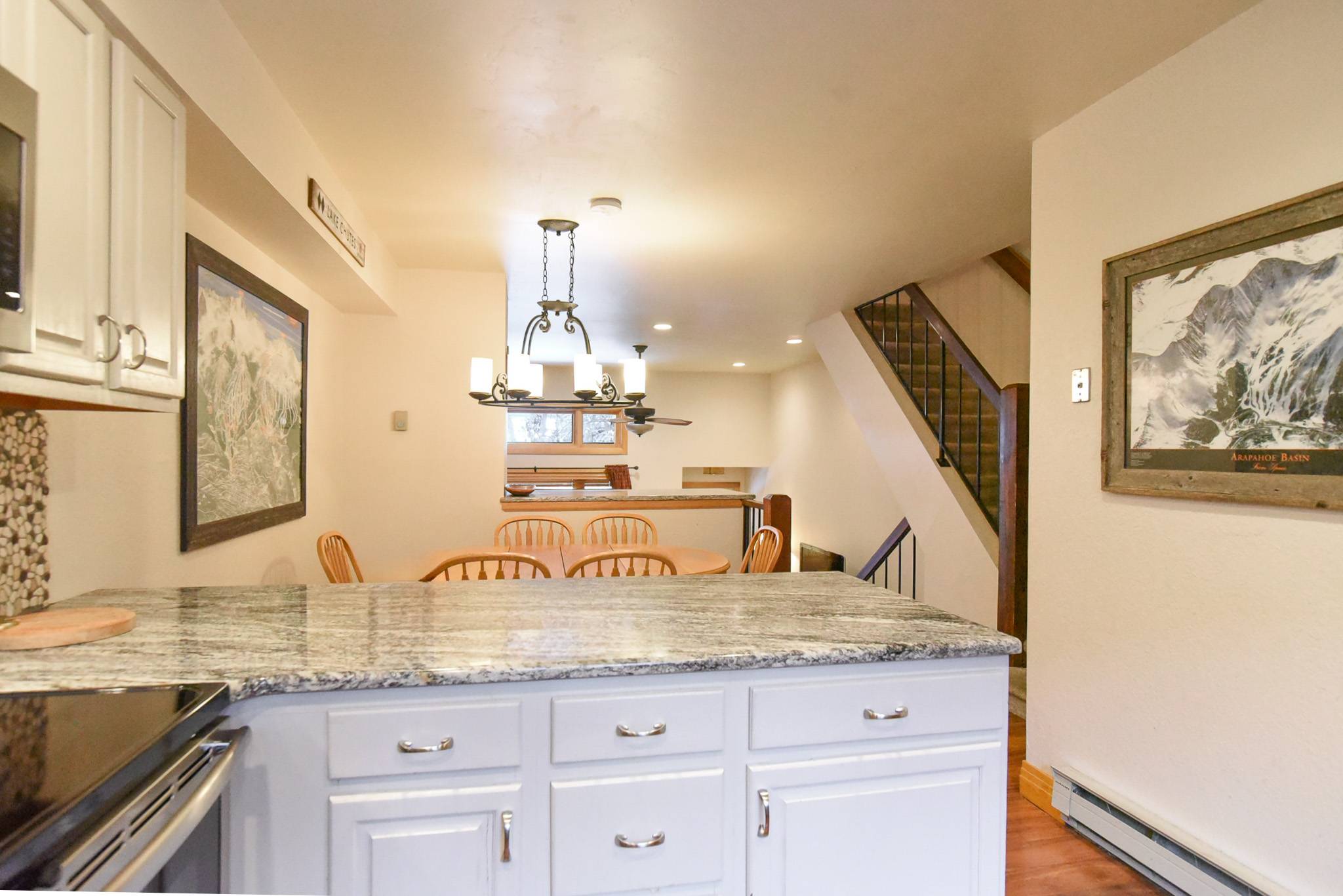 Step inside and you’ll find a comfortable, well-designed layout that makes gathering easy. The living area features a fireplace, smart TV, and spacious sectional perfect for relaxing after a full day on the slopes or trails. The kitchen has been updated with granite countertops, stainless steel appliances, and plenty of counter space, offering everything the chefs in your group need to prepare meals together. There’s seating at both the breakfast bar and adjacent dining table for shared meals and planning tomorrow’s adventures.