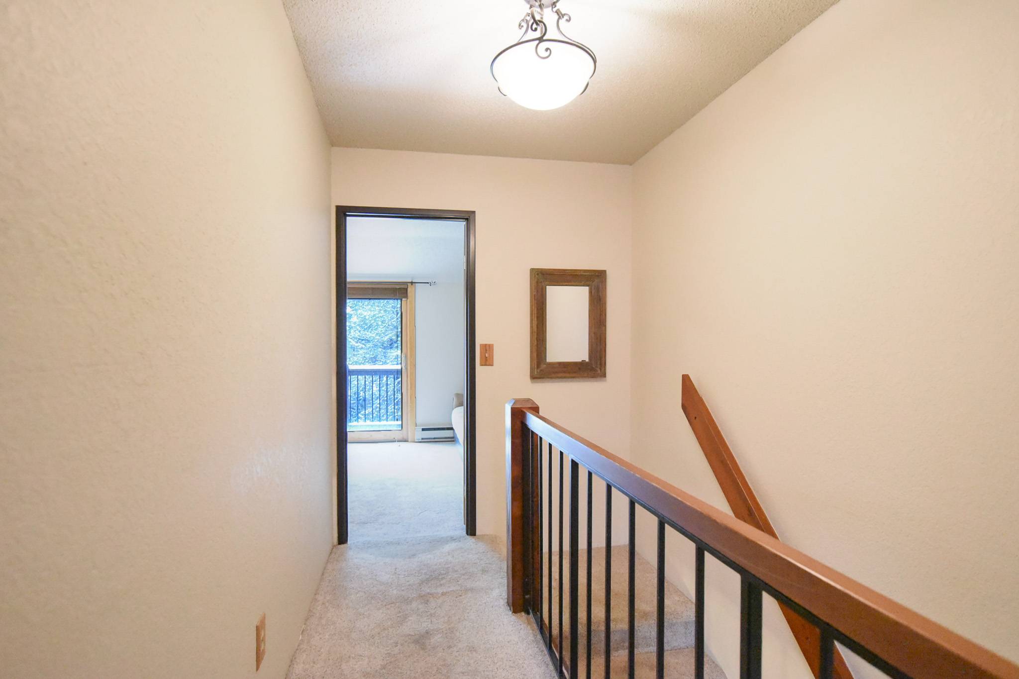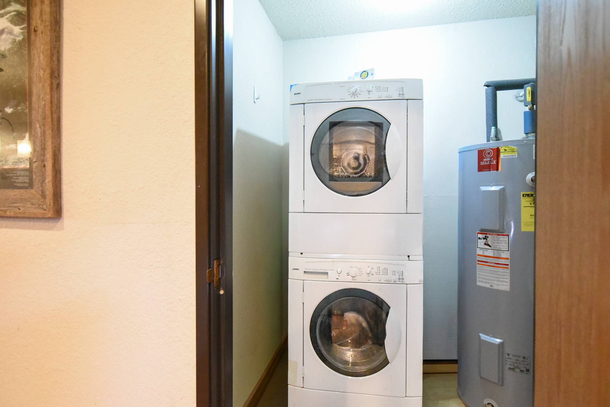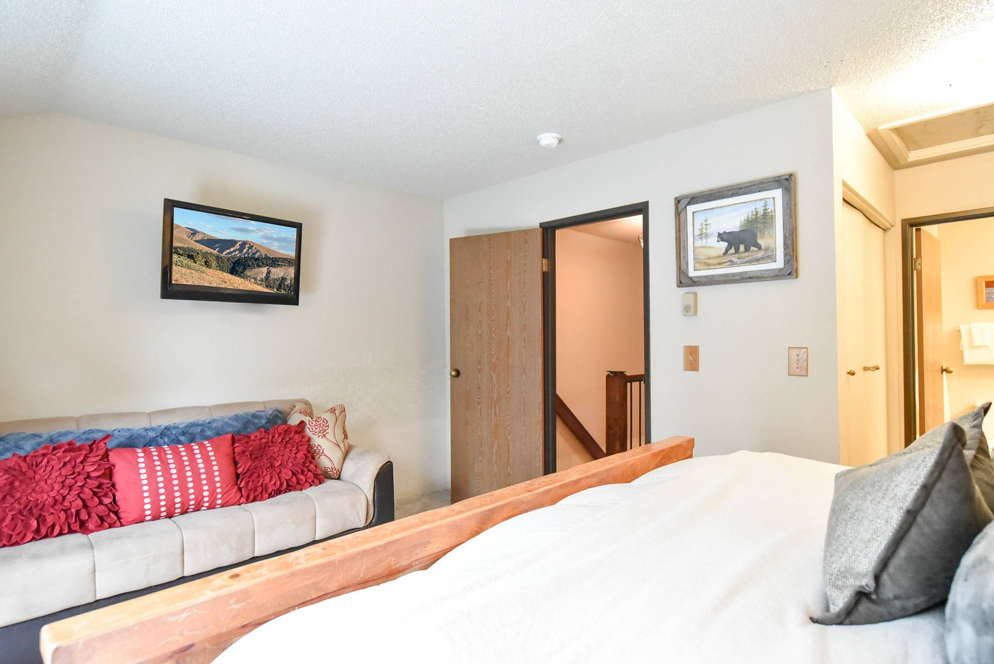 Head upstairs to two private suites. The king suite includes a TV, ensuite bathroom, and its own small patio for a quiet moment of fresh mountain air. The second bedroom is a bunk suite with its own private bathroom as well, providing comfort and convenience for families and groups alike. On the main level, you’ll also find a half bathroom, an in-unit washer and dryer, and access to a private patio off the living room.