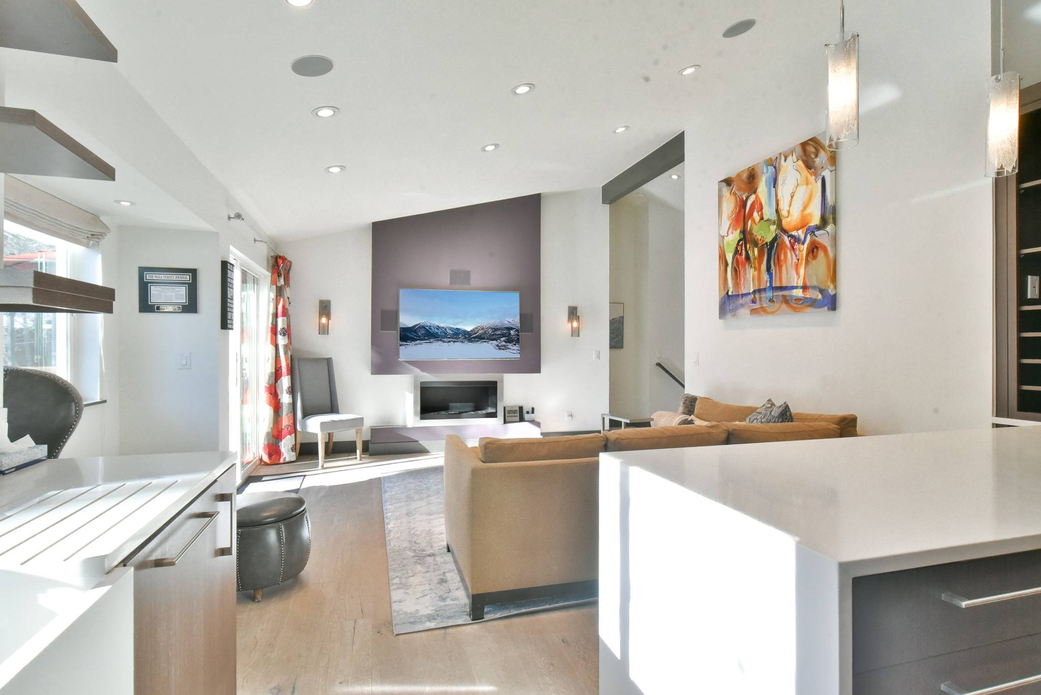 Inside, the home is filled with natural light and thoughtful updates throughout. The west-facing orientation brings in warm afternoon sun and beautiful views of Mt. Royal, especially from the living space and patio. Hardwood floors span the main level, vaulted ceilings add volume and openness, and the recently updated kitchen features stainless steel Thermador appliances, an induction cooktop, generous countertops, and a breakfast bar. A dedicated dining area with a large table makes it easy for everyone to gather for meals, games, or planning the next adventure.
